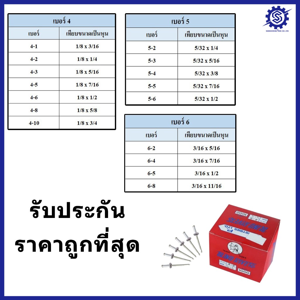 (แพ็ค 50 ตัว) ตะปูยิงรีเวท Blind Rivet ตราคนป่า เบอร์ 4 , 5 , 6 (สีเงิน อลูมิเนียม) # รีเวท, ลูกยิงรีเวท, เม็ดย้ำ