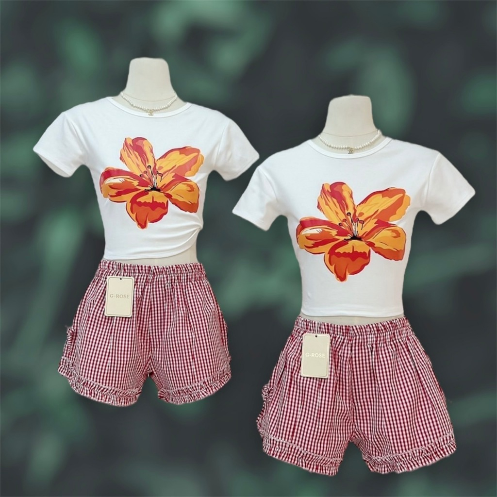 ชุดเซ็ท 2 ชิ้น กางเกงขาสั้นสก๊อตแดง ชุดเซ็ทเสื้อยืดลายดอกไม้สีขาว น่ารักๆ กางเกงสก๊อต แนวคาเฟ่ ป้าย G-ROSE (G003).