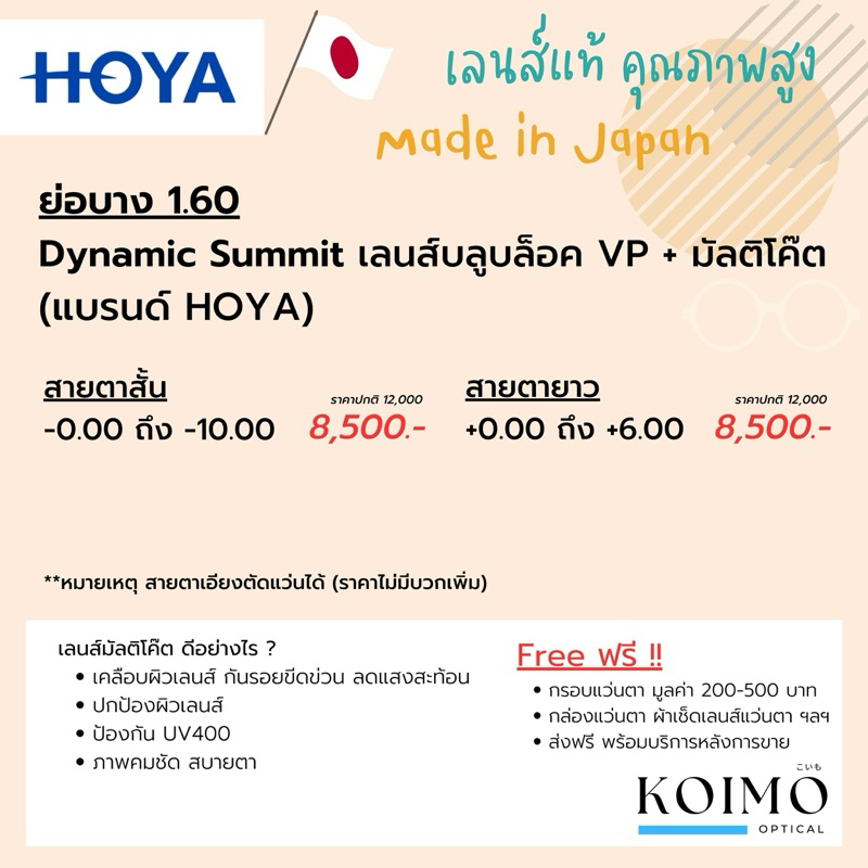 ตัดแว่นออนไลน์ HOYA Dynamic Summit (Meiryo Clear) [ย่อบาง1.60] สายตาสั้นยาวเอียง บลูบล็อค มัลติโค๊ต (ประสบการณ์ 20 ปี+)