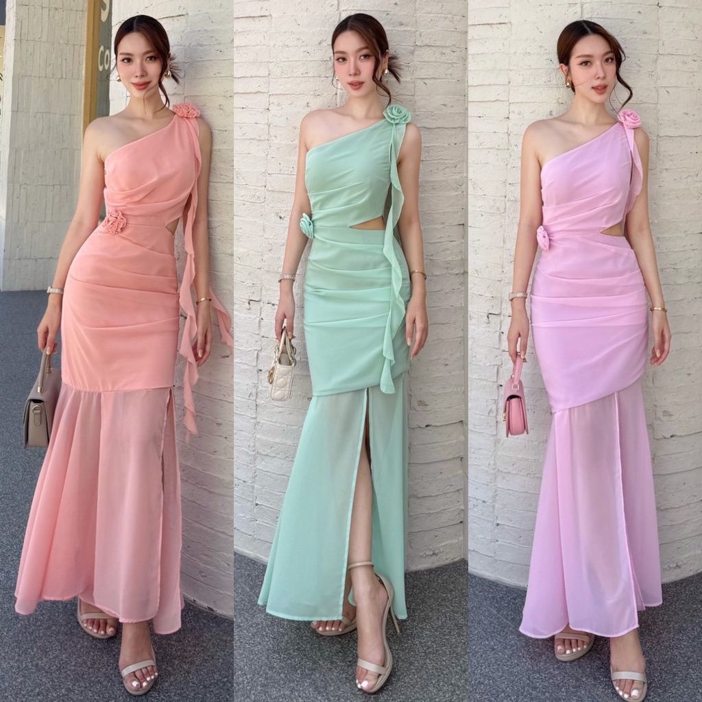 🚩ร้านโค้ดคุ้ม🚩 STYLISTA เดรสปาดไหล่ข้างเดียว แต่งดอกกุหลาบ ใส่ออกงาน งานแต่ง ดินเนอร์ ปาร์ตี้ ออกเดท