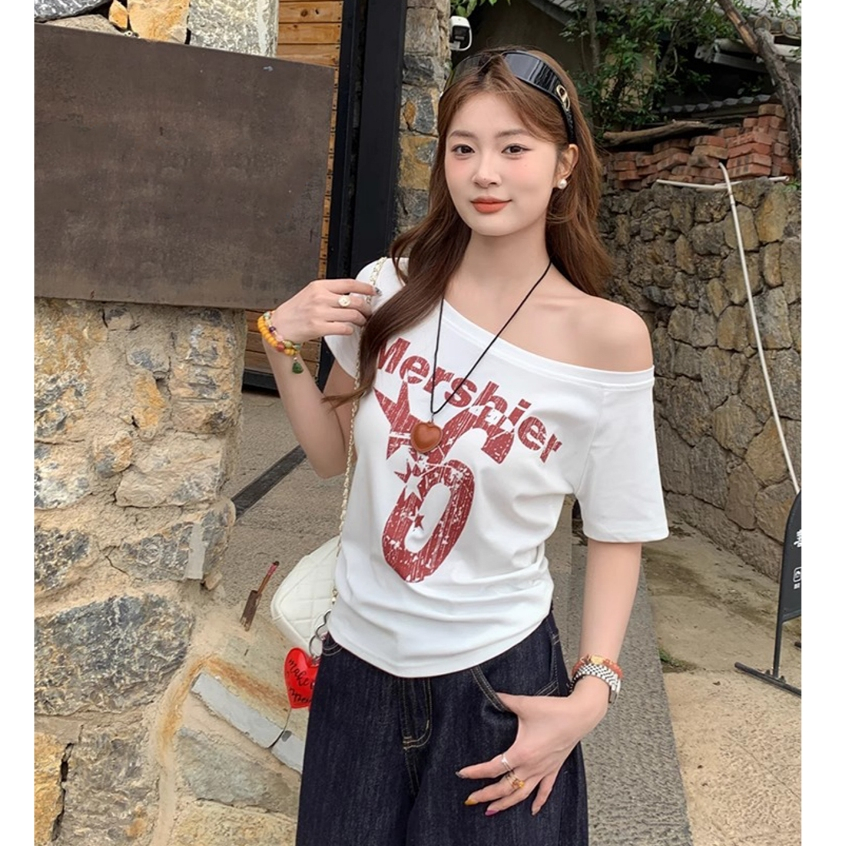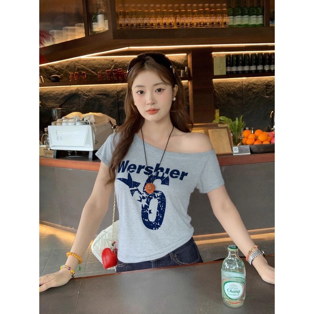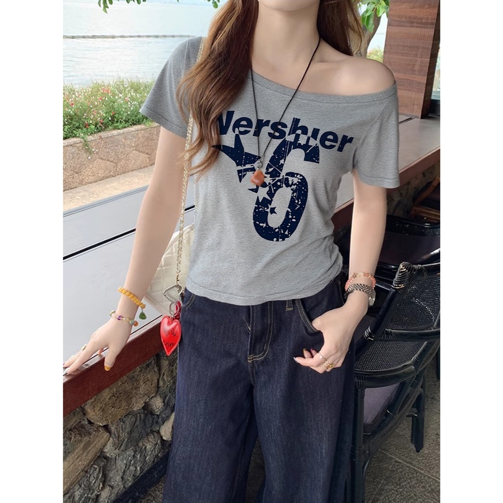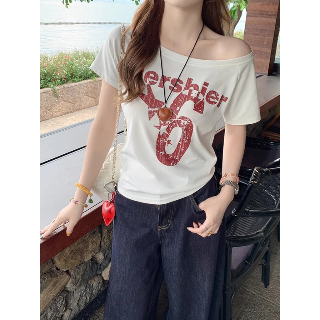 เสือยืดเเขนสั้น เสื้อยืดปาดใหล่ ทรงหลวม กันเเดด ลายอักษร เนื้อผ้านิ่ม #020320