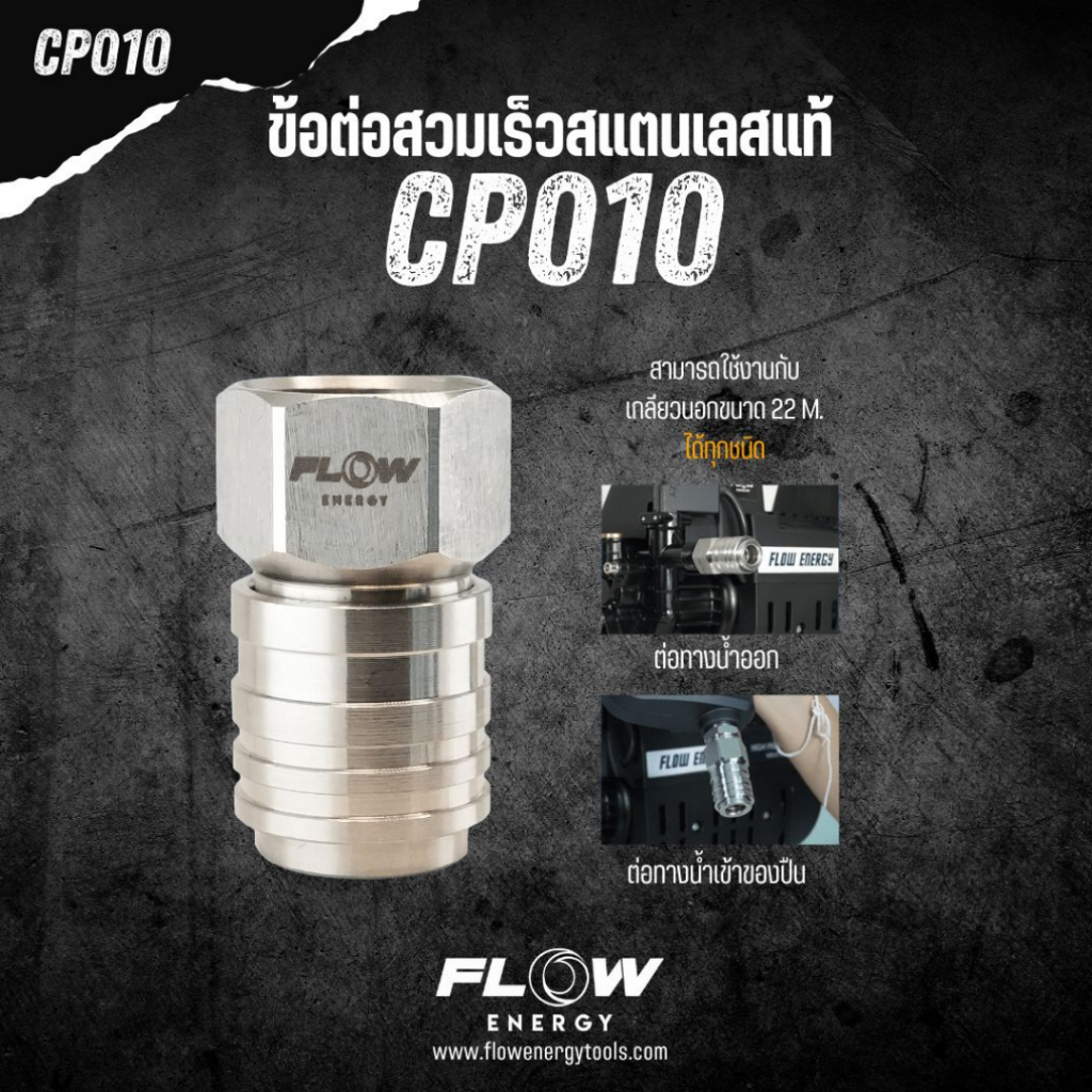 Flow Energy ข้อต่อสวมเร็วสแตนเลสแท้ CP010 วัสดุคุณภาพสูง ขนาดเกลียวใน M22 มม. ขนาดสวมเร็ว M11.8 มม.