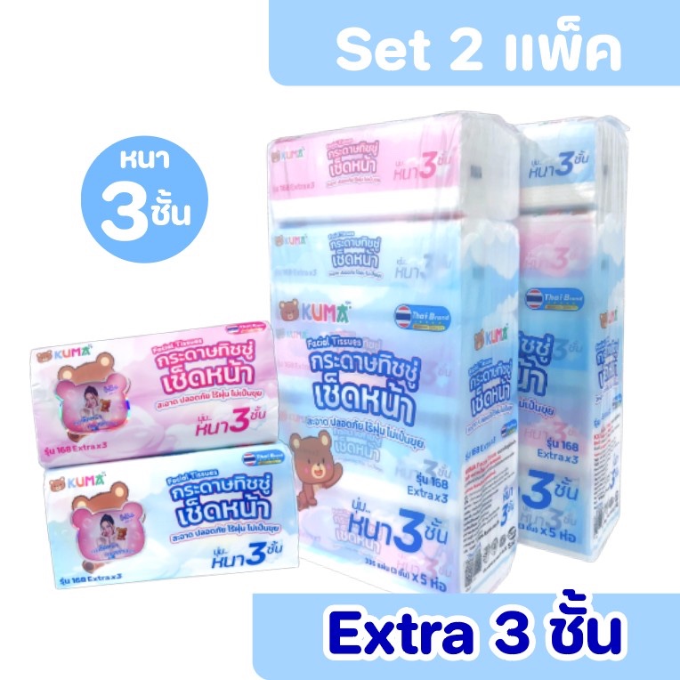 (LIVE)[โปร 2แพค] KUMA กระดาษทิชชู่เช็ดหน้า คุมะ ขนาด 168แผ่น หนา3ชั้น แพค 5ห่อ