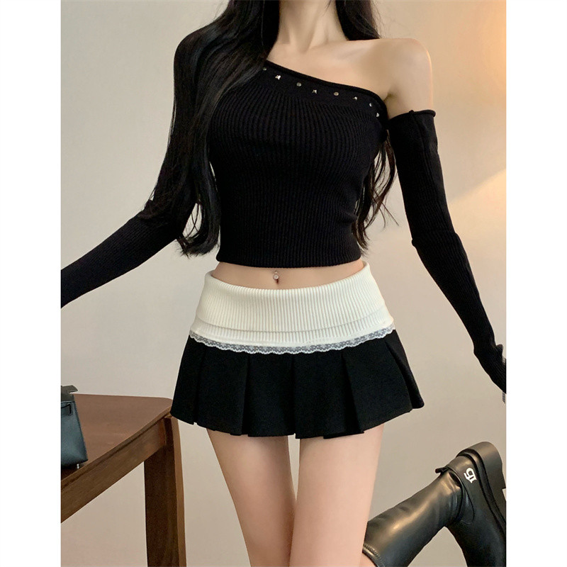 Mukok ฤดูใบไม้ร่วงใหม่ผู้หญิงเกาหลีเอวต่ําถักลูกไม้เย็บปะติดปะต่อกันจีบกระโปรงสั้น 240920