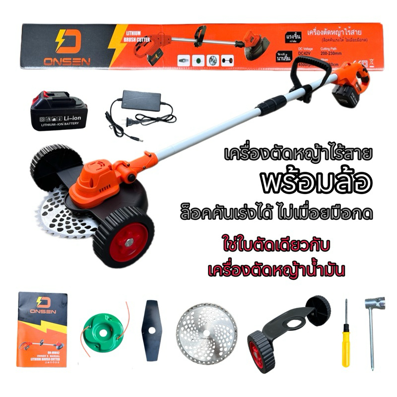 เครื่องตัดหญ้า ONSEN ตัดหญ้าไร้สาย พร้อมชุดล้อ 42V บัสเลส มอเตอร์ทองแดงแท้ ระบบเฟืองทด #ล็อคคันเร่งได้ไม่เมื่อยมือกด