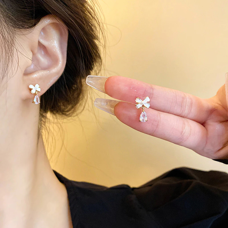 2025ใหม่ โบว์มุกหยดน้ําเพทายต่างหูที่ละเอียดอ่อนขนาดเล็กน่ารักต่างหูทุกวันการออกแบบเฉพาะทุกการแข่งขันต่างหู