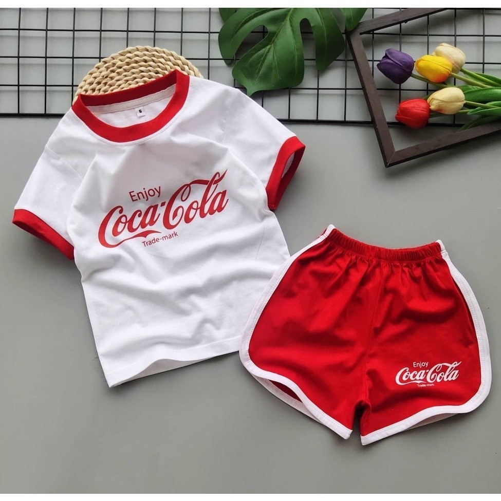 ชุดเซ็ตเด็ก ชุดนอนเด็ก สกรีนลาย โคคา โคล่า สีขาว แดง (เสื้อยืดแขนสั้น+กางเกงขาสั้น)