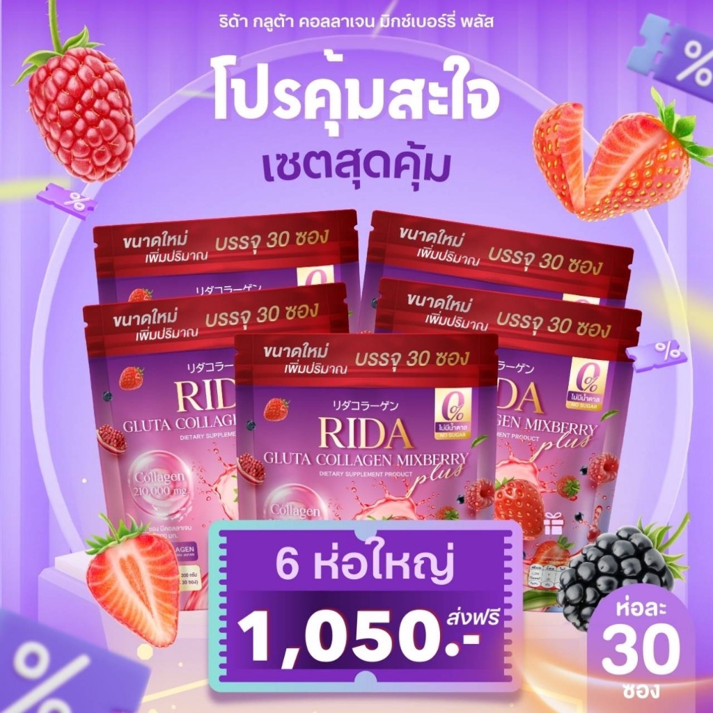 (อร่อยมาก) ริด้า กลูต้า คอลลาเจน มิกซ์เบอร์รี่ คอลลาเจน 21,000 มิลลิกรัม ไม่มีน้ำตาล