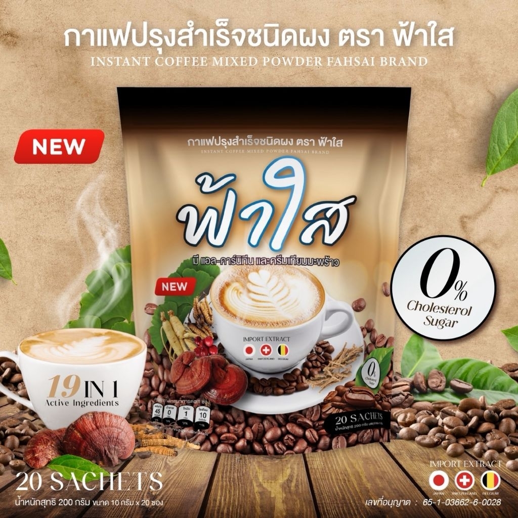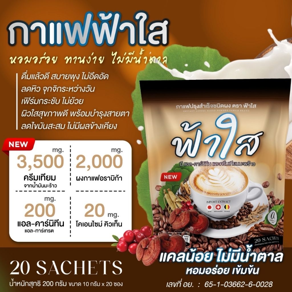 กาแฟฟ้าใส แคลน้อย ไม่มีน้ำตาล 1ห่อ ได้20ซอง exp09/2027(หวานน้อย คาเฟอีนต่ำ เน้นสมุนไพร)
