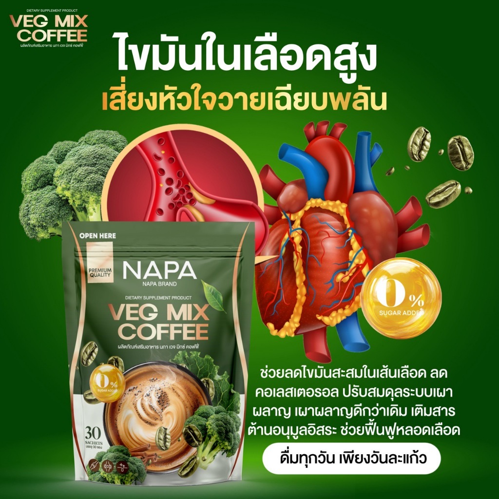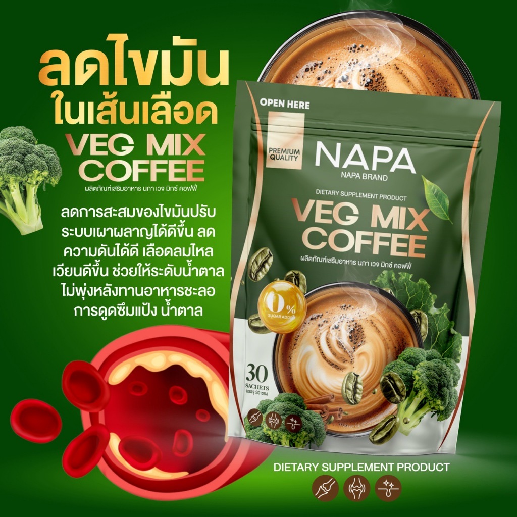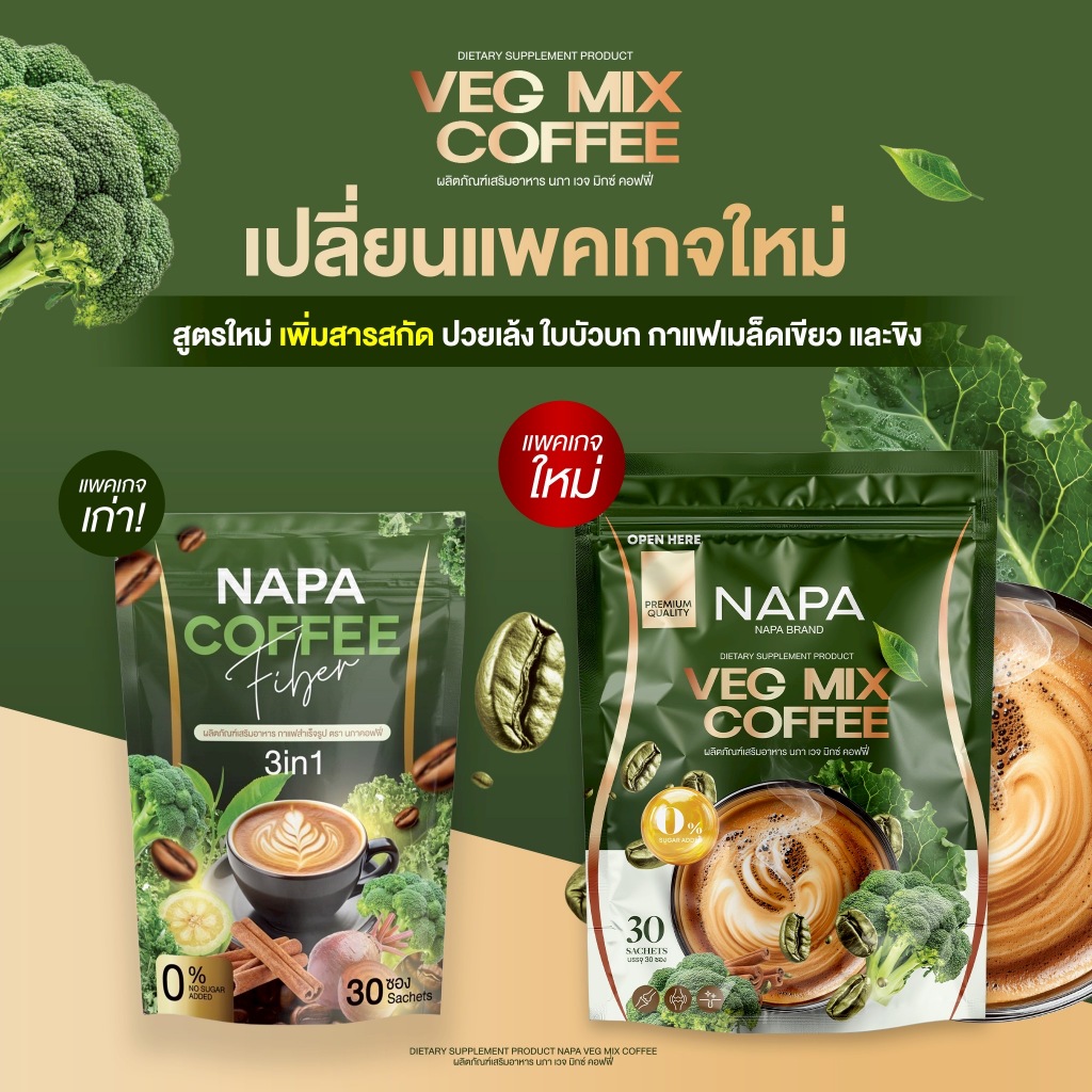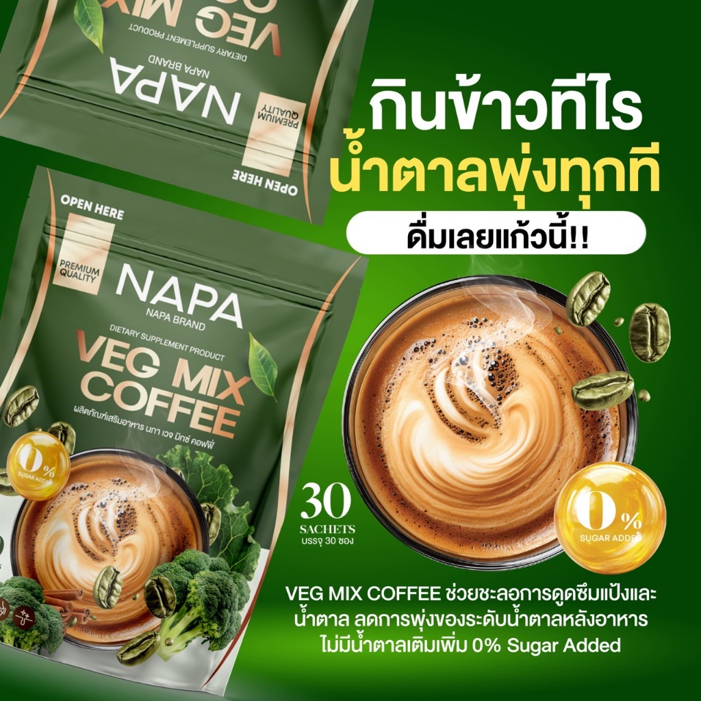 [สูตรใหม่][ตะกร้าบริษัท] Napa Veg Mix Coffee นภา กาแฟไฟเบอร์สูตรผักปวยเล้ง 1แถม1 (60 ซอง)