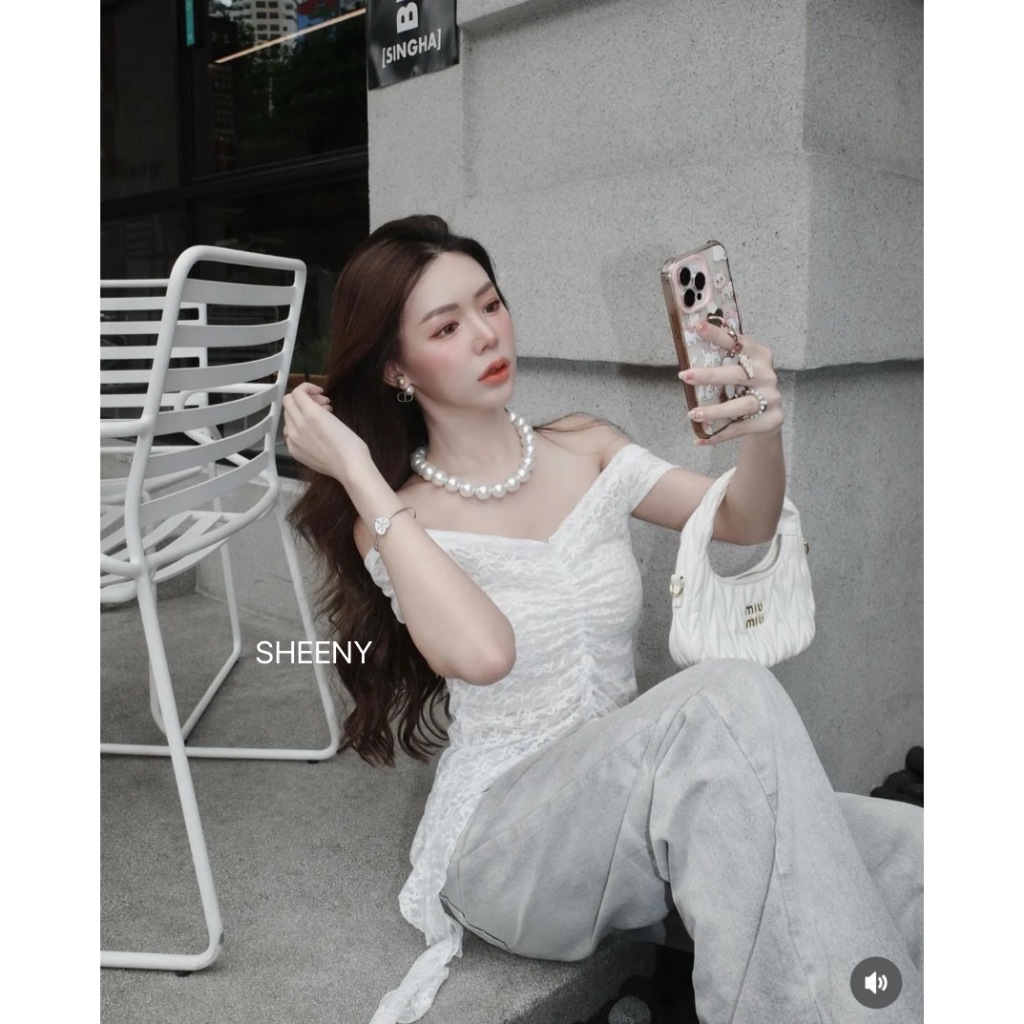 KIKI LACE : เสื้อลูกไม้ปาดไหล่ สาวอวบ เสื้อปาดไหล่แต่งลูกไม้เซ็กซี่ มีข้างยาว แนว Y2K เซ็กซี่ ป้าย Sheeny