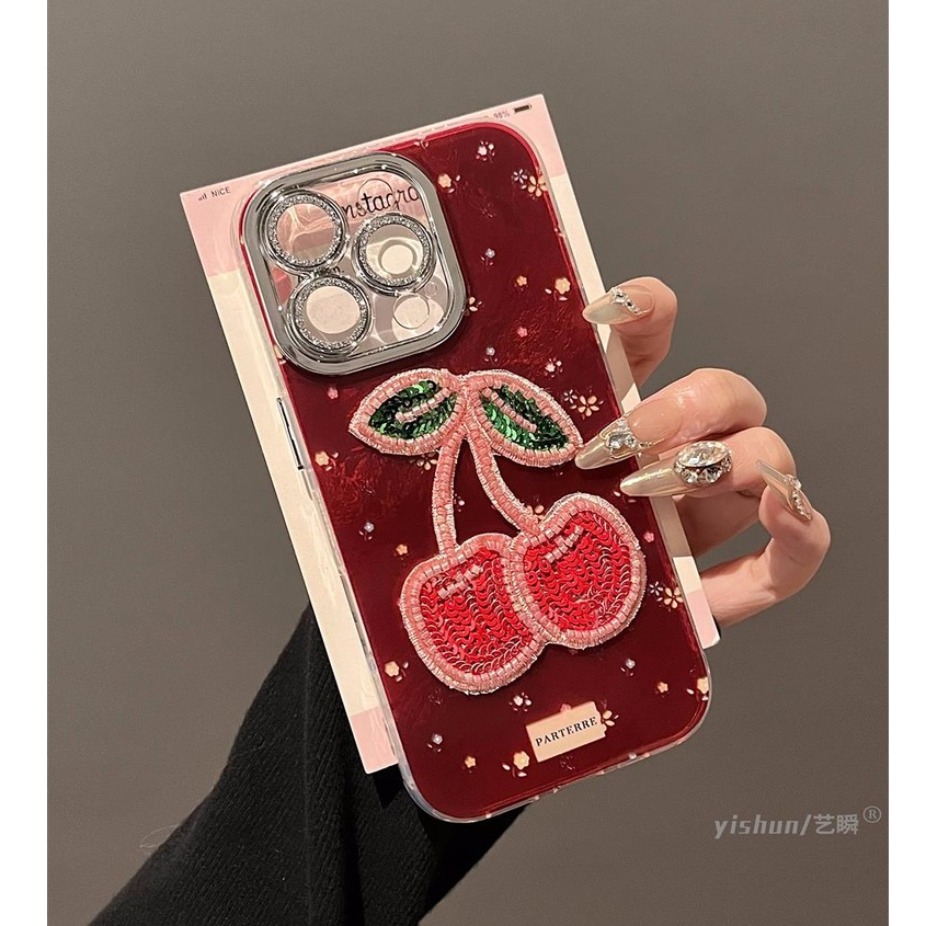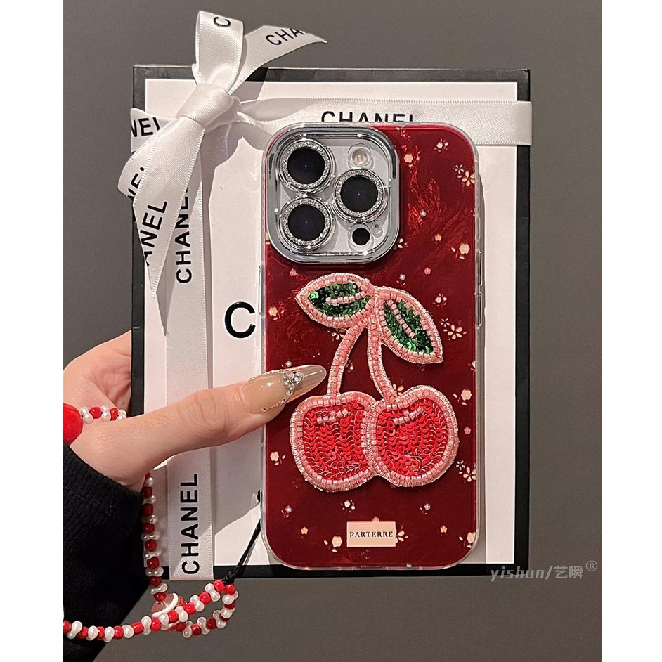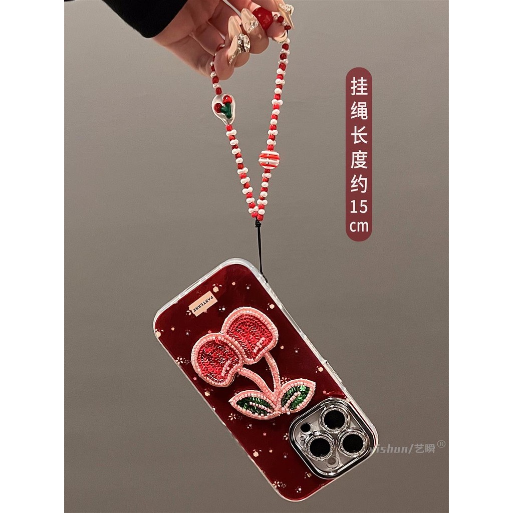 Glitter เลนส์ป้องกันฟิล์ม 3D ลูกปัดเชอร์รี่ดอกไม้สีแดง Wrsit โซ่เคสโทรศัพท์สําหรับ iPhone 17Promax 12 13 Promax 11 14 15 16 Pro Max ผู้หญิงมือถือปลอก