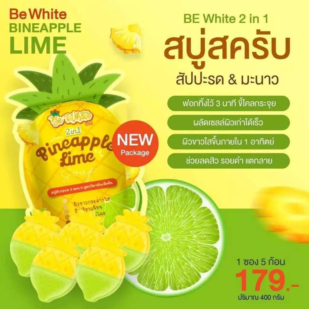 แพคเกจใหม่ (1ห่อ มี 5ก้อน) สบู่สับปะรด & มะนาว Be White 400 กรัม (แบ่งขาย 1 ก้อน) 80 กรัม