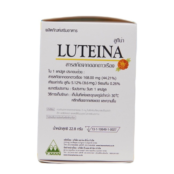 Luteina 60 Capsules ลูทีน่า สารสกัดจาก ดอกดาวเรือง บำรุงสายตา ขนาด 60 แคปซูล 1 กล่อง