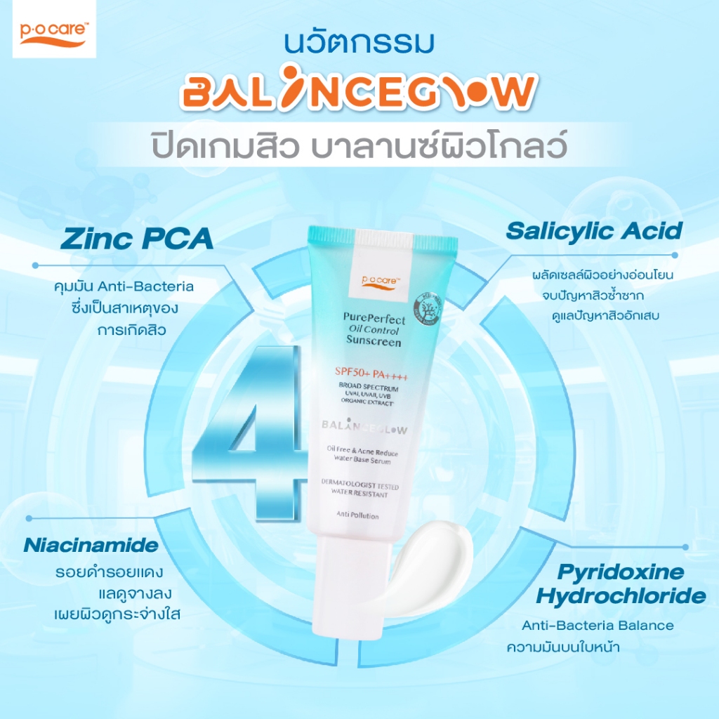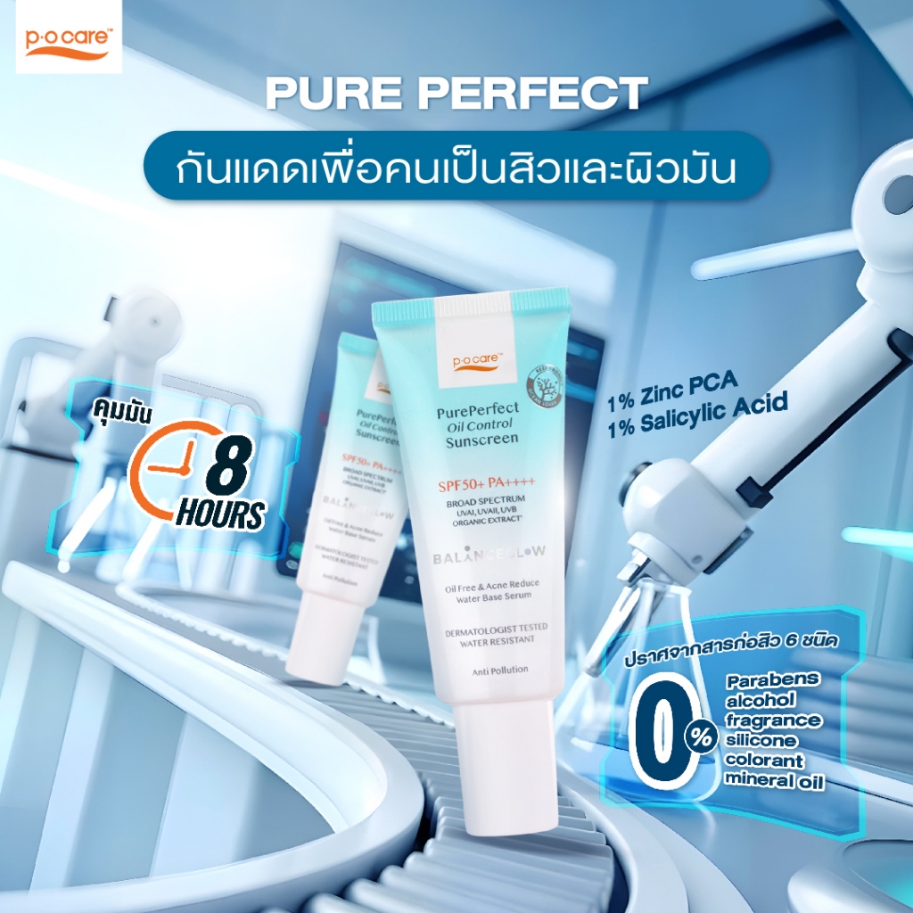 POCARE Pure Perfect Oil Control Sunscreen SPF50+ PA++++ 40ml กันแดดเนื้อน้ำ คุมมัน 8 ชม กันน้ำ ลดสิว