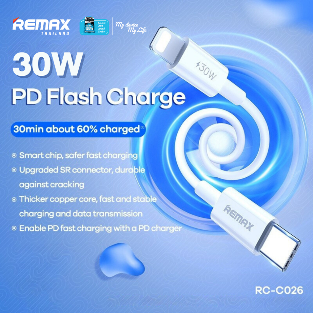 Remax Cable RC-C026 - สายชาร์จ Type-C to IP ชาร์จเร็ว PD 30W ยาว 1 เมตร