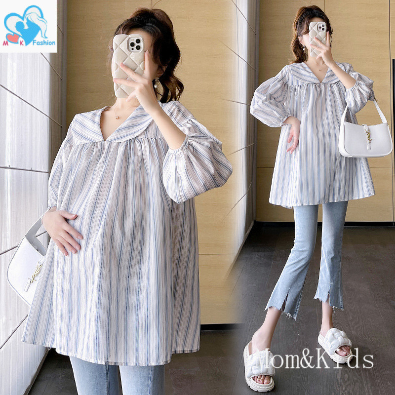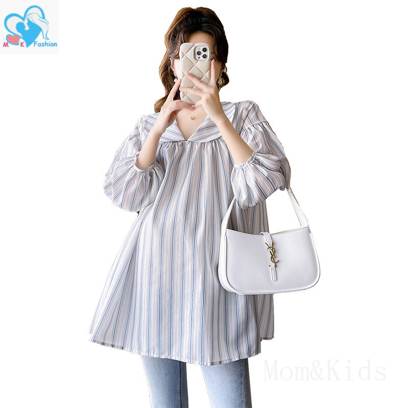 แม่ & เด็กคลอดบุตรเสื้อแฟชั่นลําลองตุ๊กตาคอกลางความยาวคลอดบุตรลายด้านบน