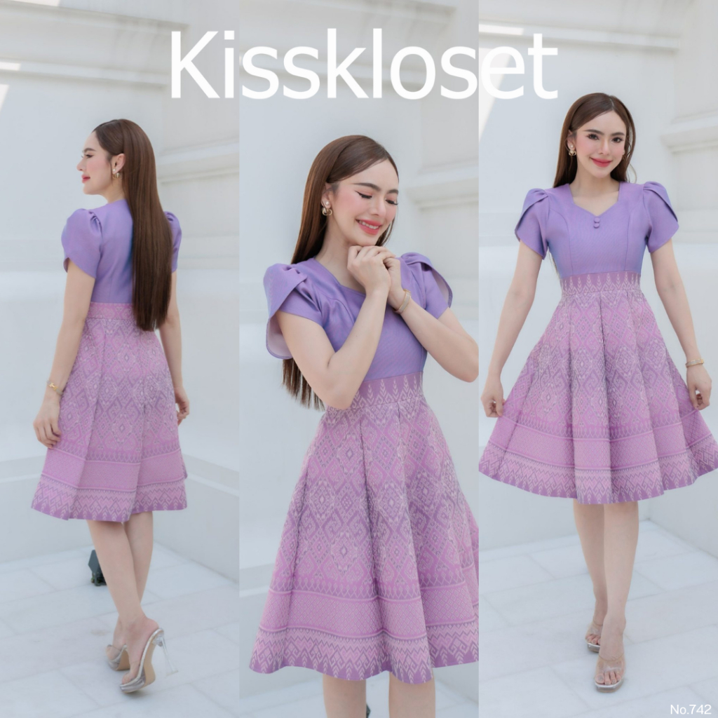 ชุดเดรสผ้าทอลาย แขนกลีบบัว คอหัวใจ กระโปรงบาน 8 ชิ้น อัดกาวทั้งชุด ซิปซ่อนหลัง (S-5XL) KS742