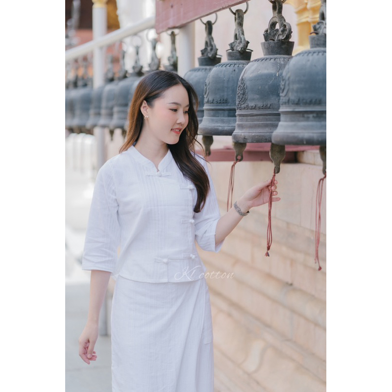 เสื้อผ้าฝ้ายด็อบบี้สีขาวนวล แต่งกระดุมจีน ชุดทำบุญ