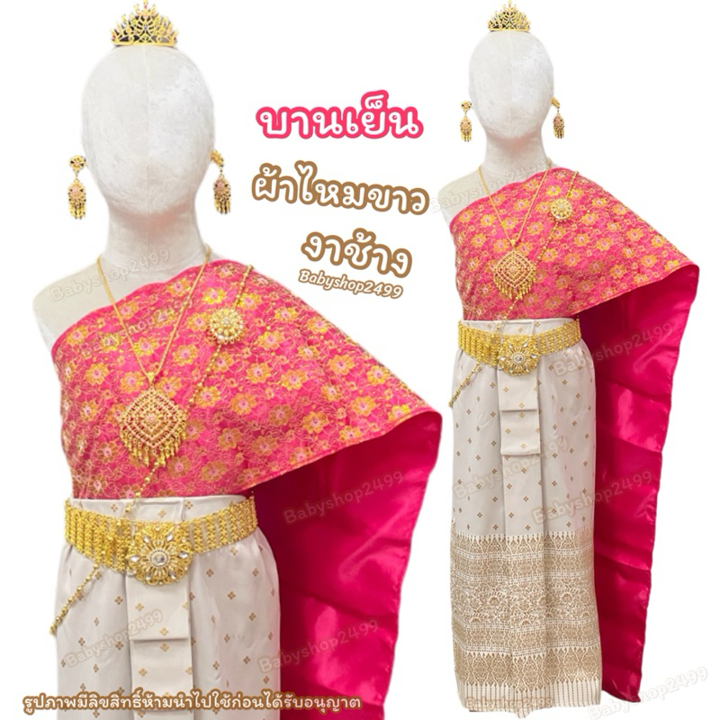 ชุดไทยเด็ก สไบ+ผ้าถุง ผ้าไหมสีงาช้าง สำเร็จรูป (อกกับเอวยางยืด) พร้อมส่ง