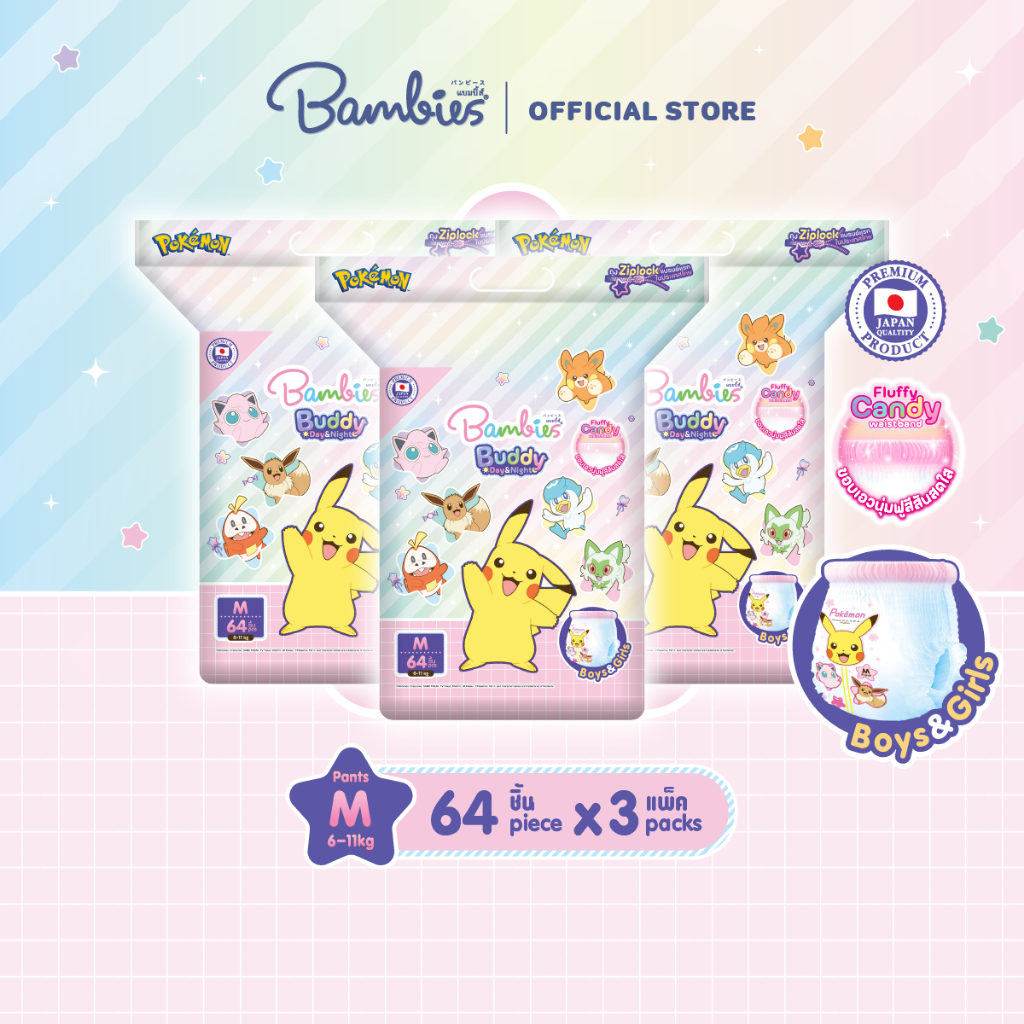 [ยกลัง] BAMBIES Buddy Day&Night Pants ผ้าอ้อมเด็กแบบกางเกง ซึมซับ10ชม. ไซส์ M-XXXL (3แพ็ค)
