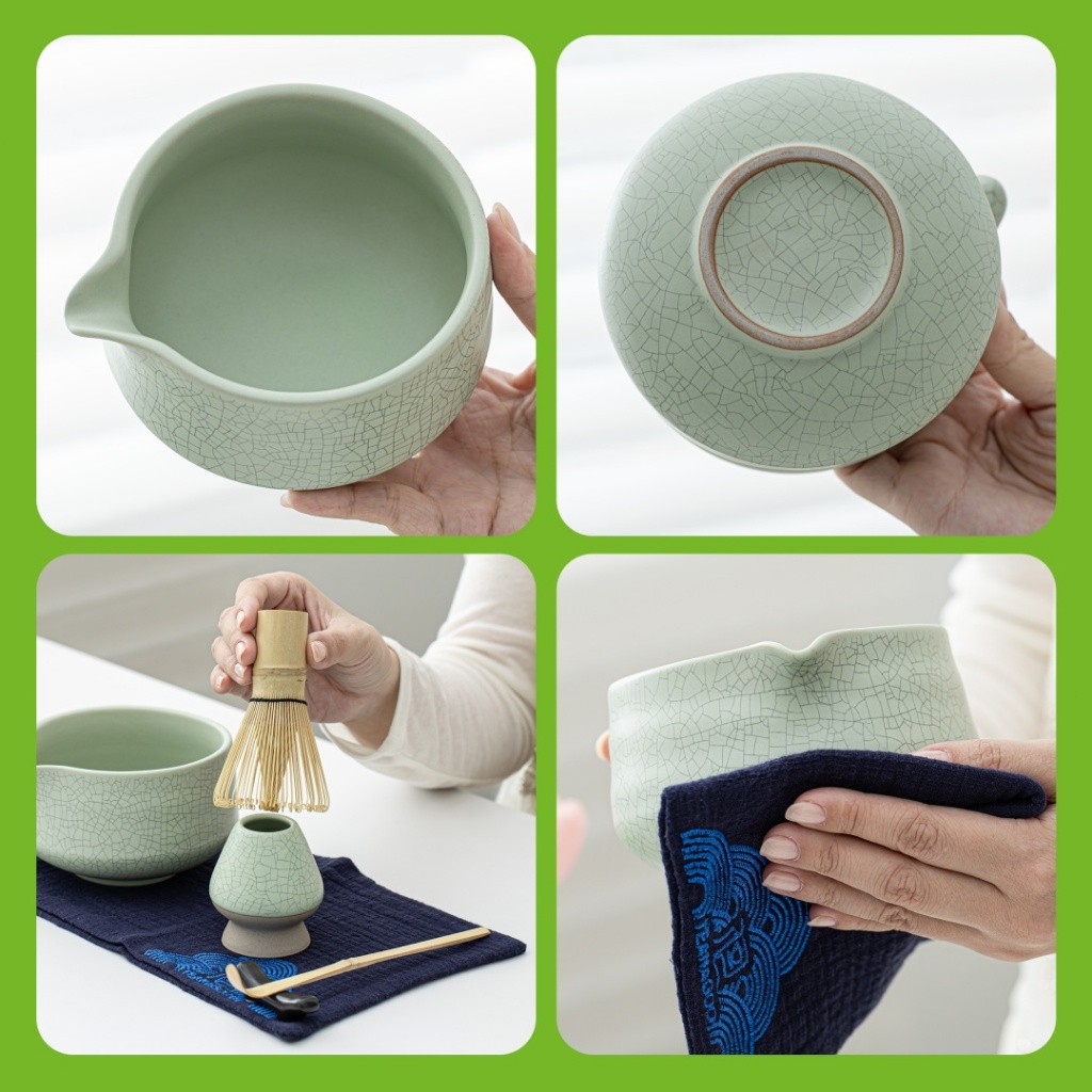 TEANAGOO Matcha Whisk Set สีเขียว,7 ชิ้น Matcha Set,Matcha Kit สําหรับพิธี,ชุดน้ําชามัทฉะสําหรับทําอาหารเช้า/ลาเต้,Green Matcha Bowl(Cwan) whith Spout และ WhiskN38