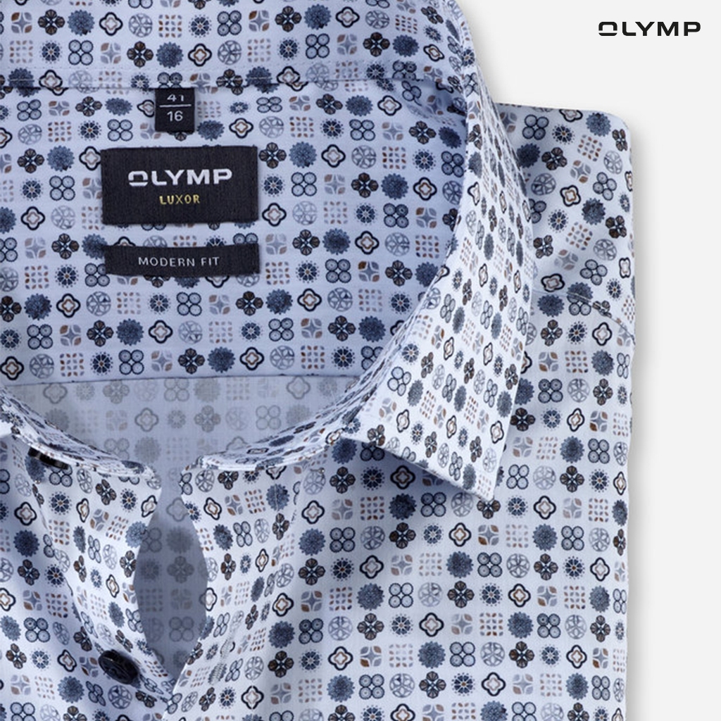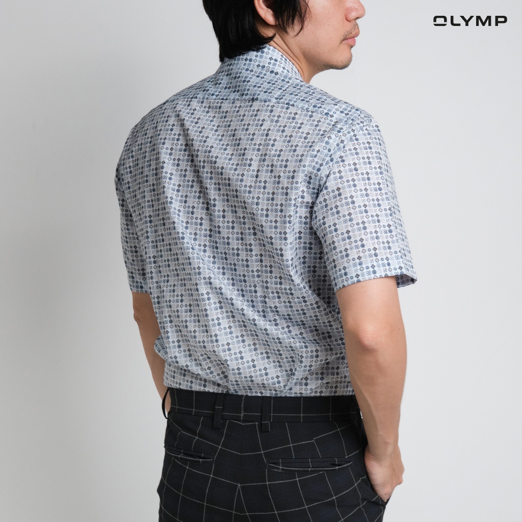 OLYMP LUXOR Shirt เสื้อเชิ้ตผู้ชายแขนสั้น สีน้ำเงิน ผ้าเรียบ พิมพ์ลายกราฟิก ทรงหลวม ใส่สบาย AUTU24