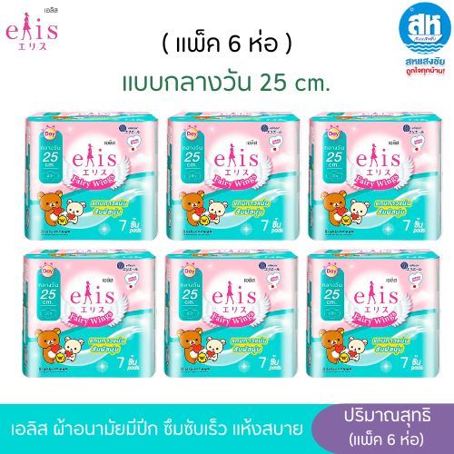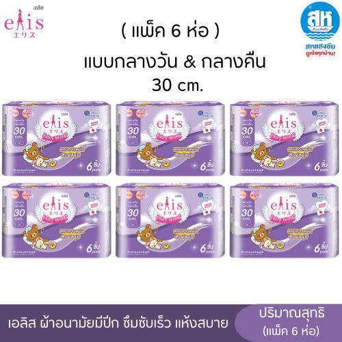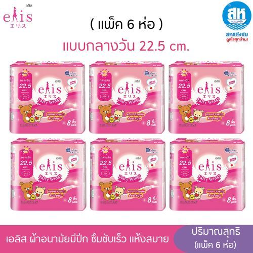 (แพ็ค6) Elis Fairy Wing Day&Night เอลิส ผ้าอนามัยซึมซับเร็ว มีปีก แห้งสบาย มีขอบปกป้องด้านข้าง ปีกนุ่ม ไม่ระคายเคือง มีห