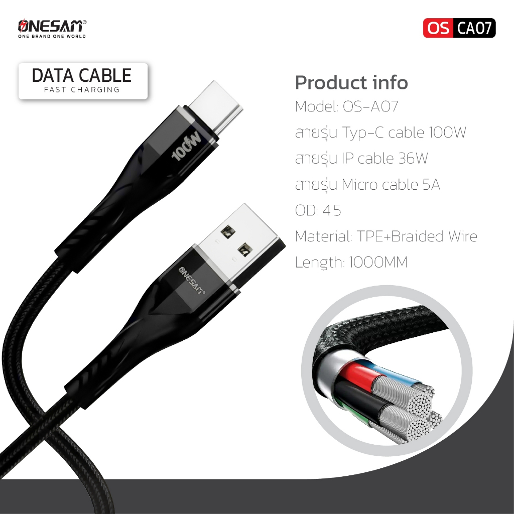 สายชาร์จและถ่ายโอนข้อมูล ONESAM รุ่น OS-CA07 สายชาร์จเร็ว มีให้เลือก 3 หัว Micro,Type C และ IP ชาร์จไว Fast charge ความ