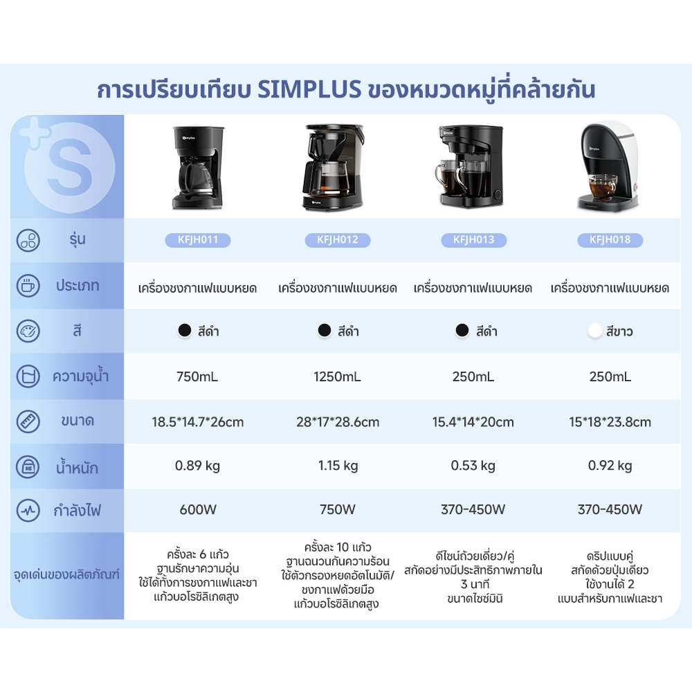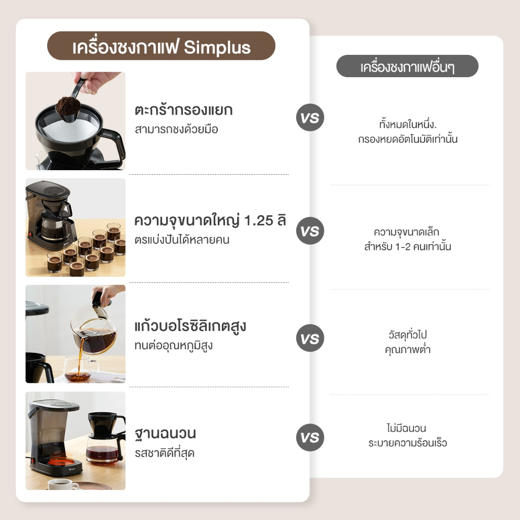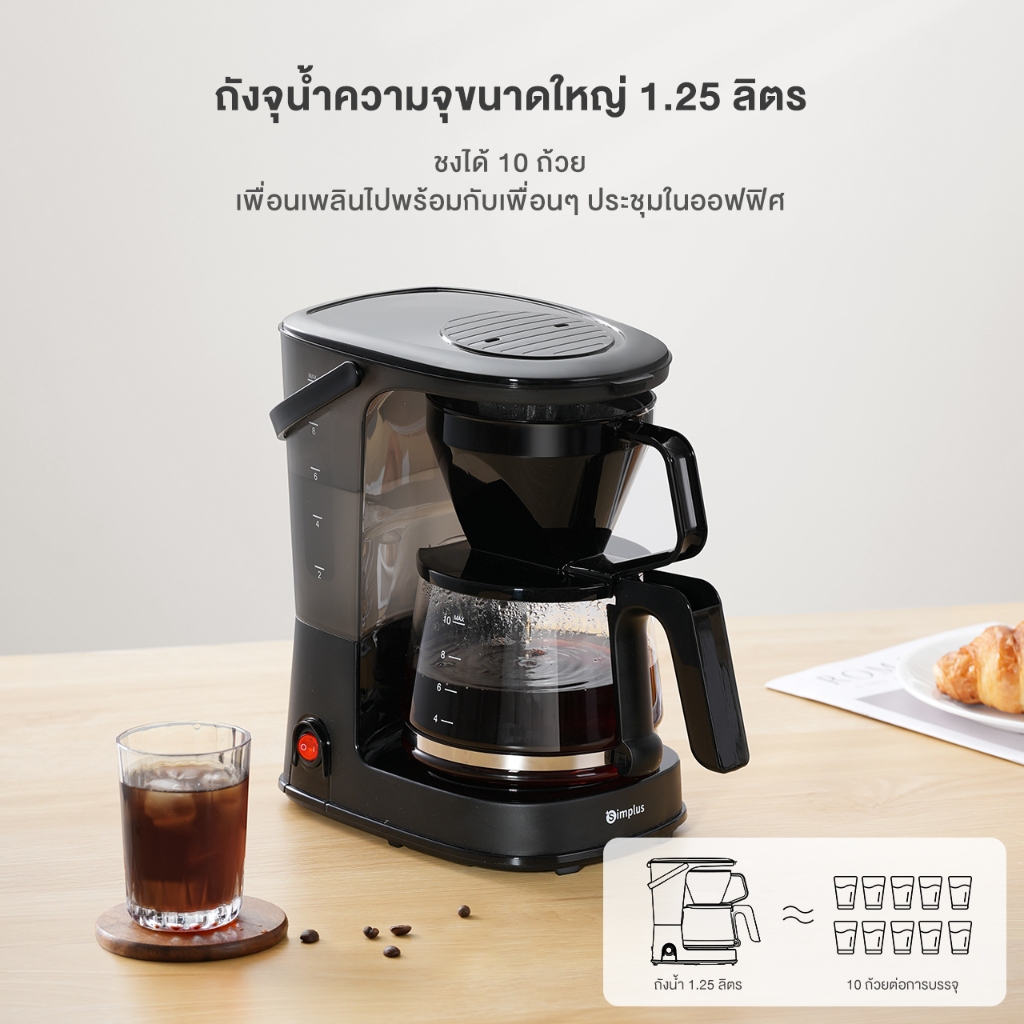 Simplus เครื่องชงกาแฟ ใช้ในครัวเรือน เครื่องชงกาแฟกรองหยด ความจุขนาดใหญ่ 1250/750 มล ชงชากาแฟ KFJH013 KFJH011