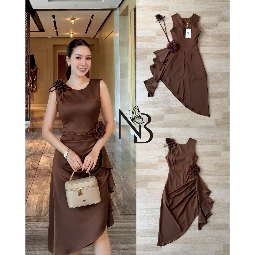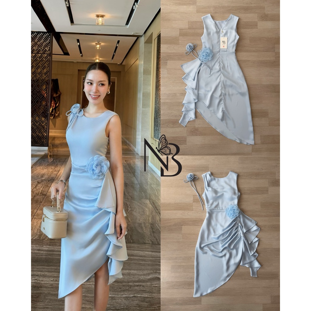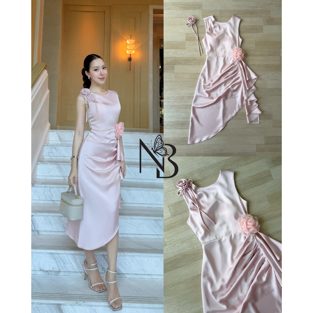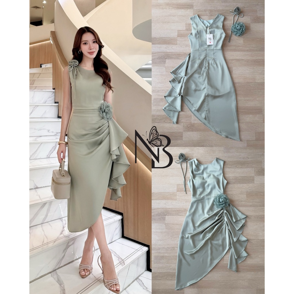 ❣️พร้อมส่ง📌 NABI เดรสซาติน สีเขียว มีดอกไม้ระบายยาว ใส่ออกงาน ไปงานแต่ง เพื่อนเจ้าสาว ดินเนอร์