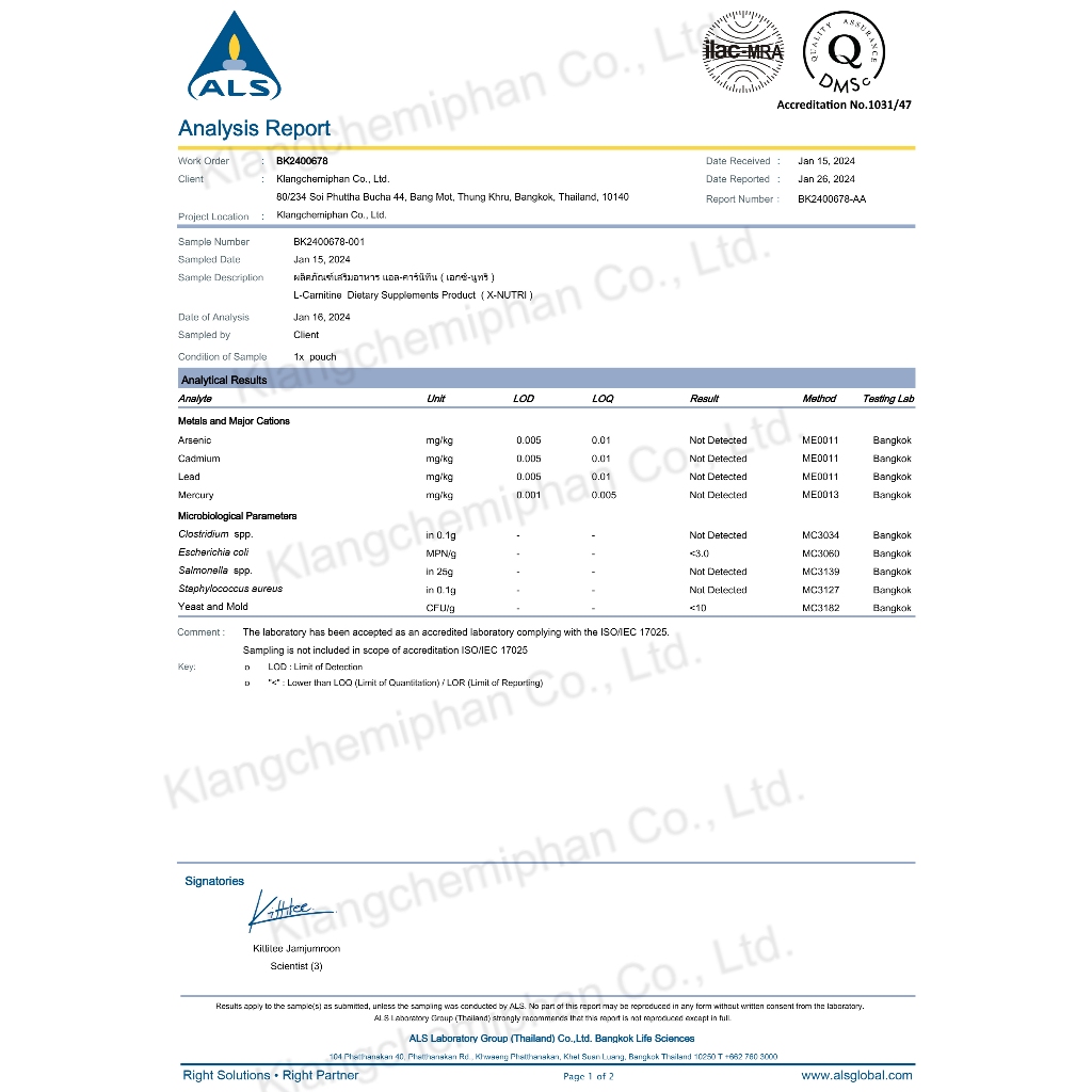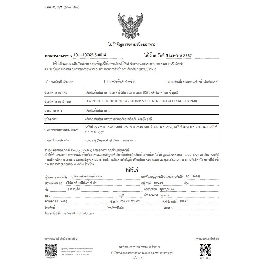 L-Carnitine X-Nutri 500mg ผลิตภัณฑ์เสริม เอ็กซ์-นูทริ แอล-คาร์นิทีน 500มิลลิกรัม 1 กระปุก 100 แคปซูล
