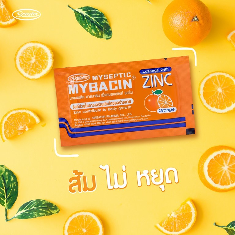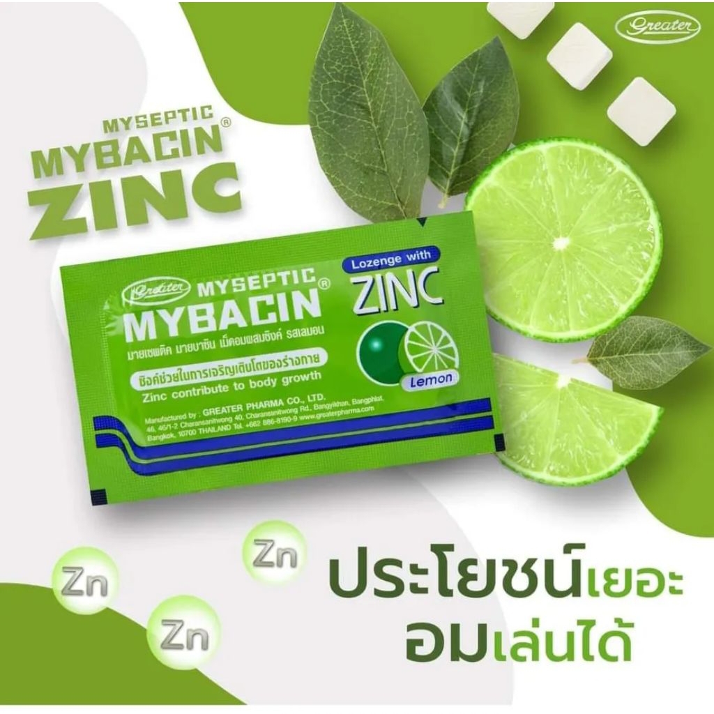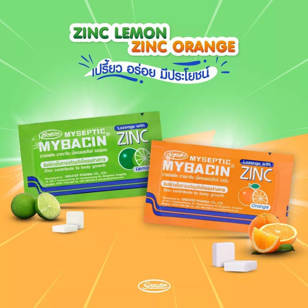 Mybacin Zinc เม็ดอม มายบาซิน ซิงค์ (รสส้ม / มะนาว) 10 เม็ด/ซอง