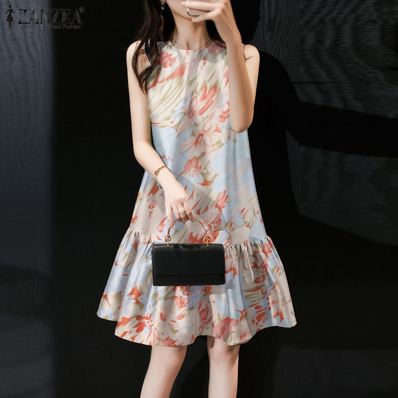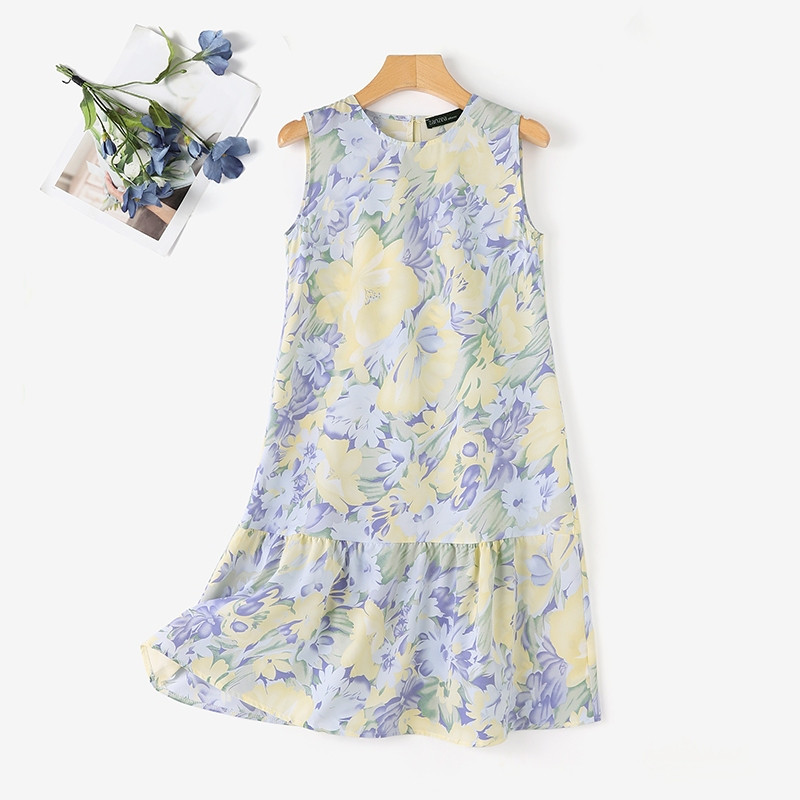 ชุดเดรสแขนกุดคอกลม พิมพ์ลายสไตล์เกาหลีสำหรับผู้หญิง