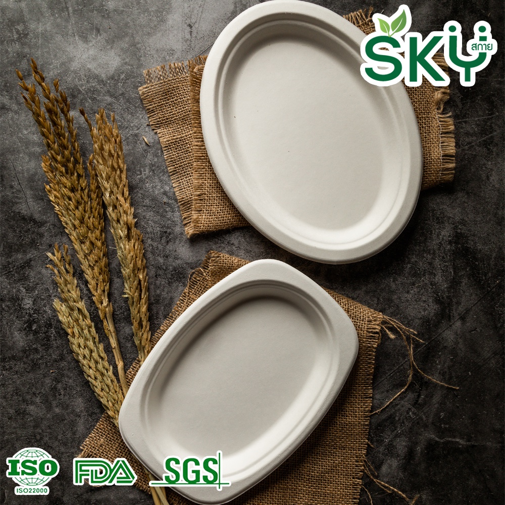[ขายส่ง 250 ชุด] SKY จานอาหารชานอ้อย จานอาหารใช้แล้วทิ้ง Food Grade ทรงวงรี ขนาด 9" 10"