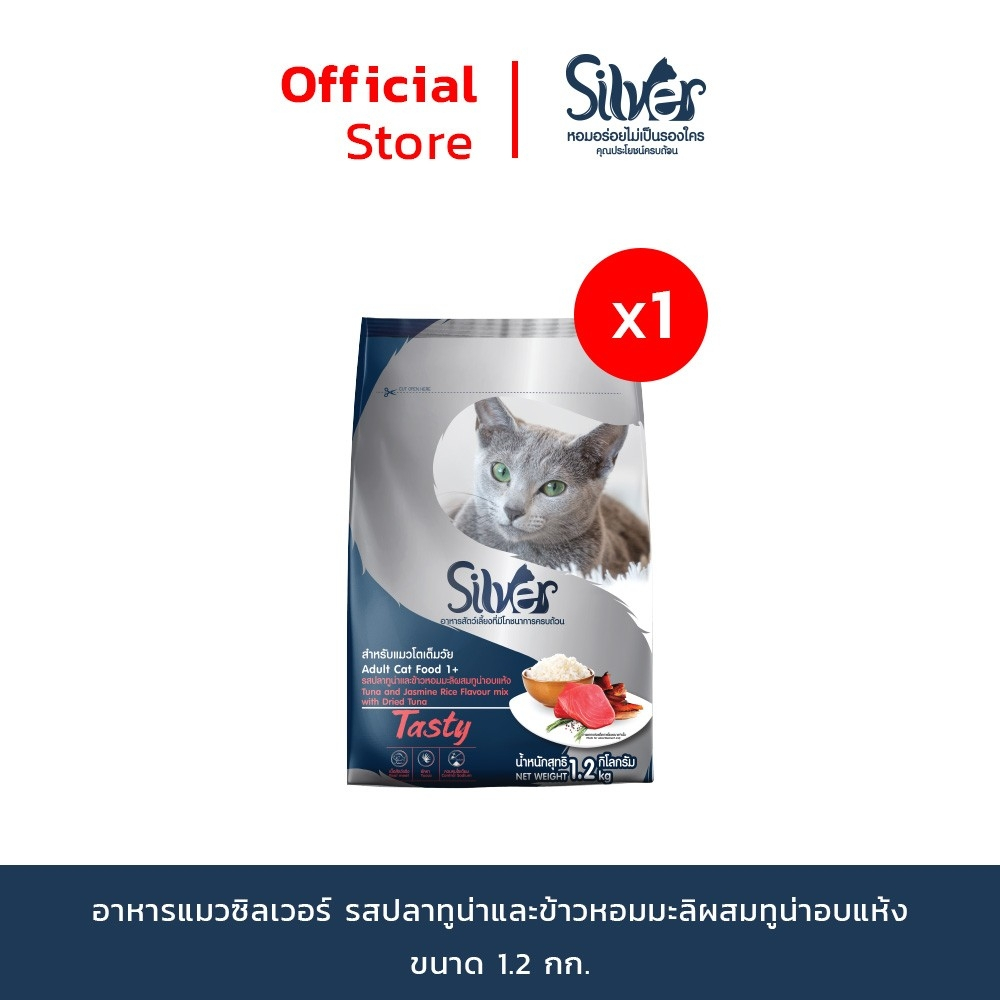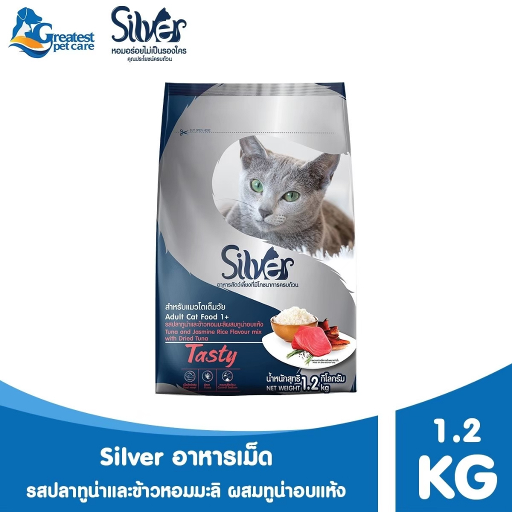 Silver รสทูน่าและข้าวหอมมะลิผสมทูน่าอบแห้งขนาด 1.2 Kg. อาหารเม็ดสำหรับแมวสูตร Tasty