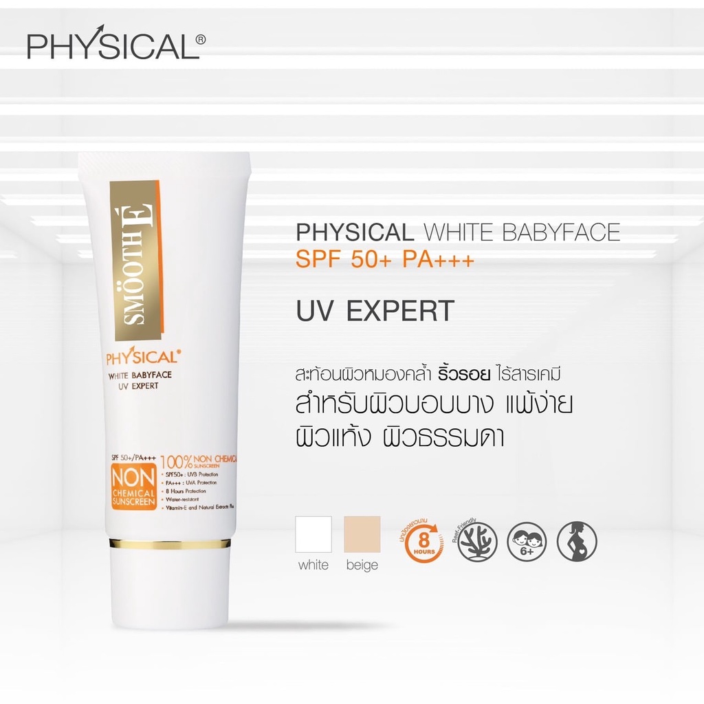 Smooth E Physical White Babyface 40g. (Beige) SPF50+ PA+++ UVExpert ครีมกันแดด สูตรอ่อนโยน ปกป้องผิวยาวนาน 8 ชม. สีเบจ