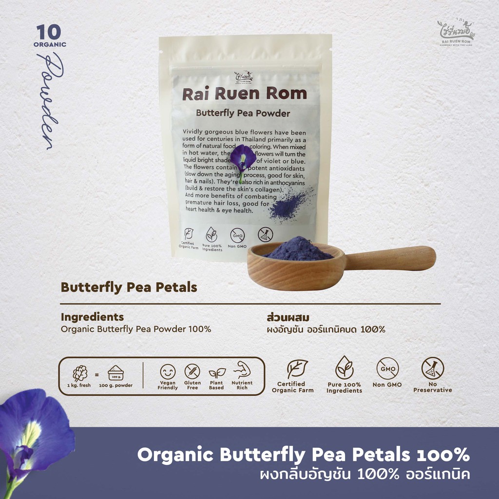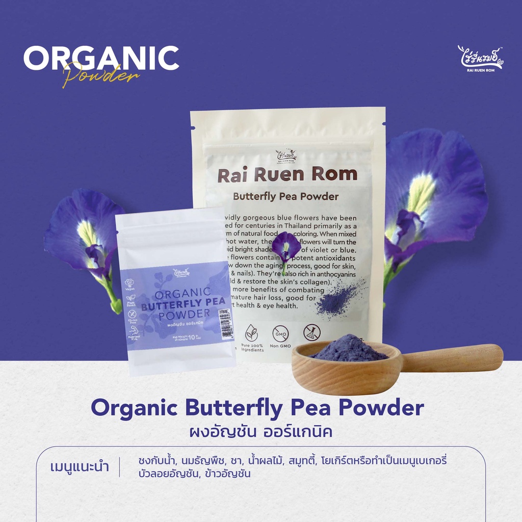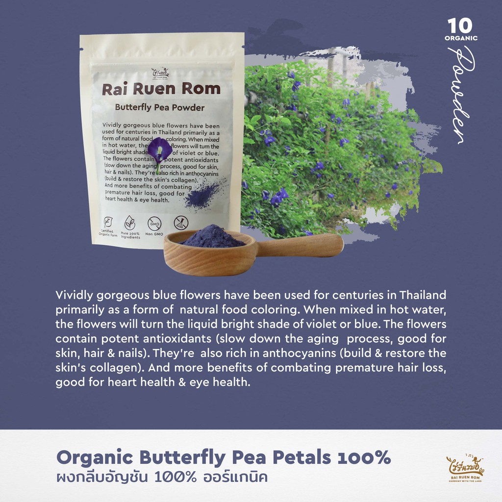 ไร่รื่นรมย์ ผงอัญชัน 100% ออร์แกนิค : Organic Butterfly Pea Powder บำรุงสายตา ลดระดับน้ำตาลในเลือด