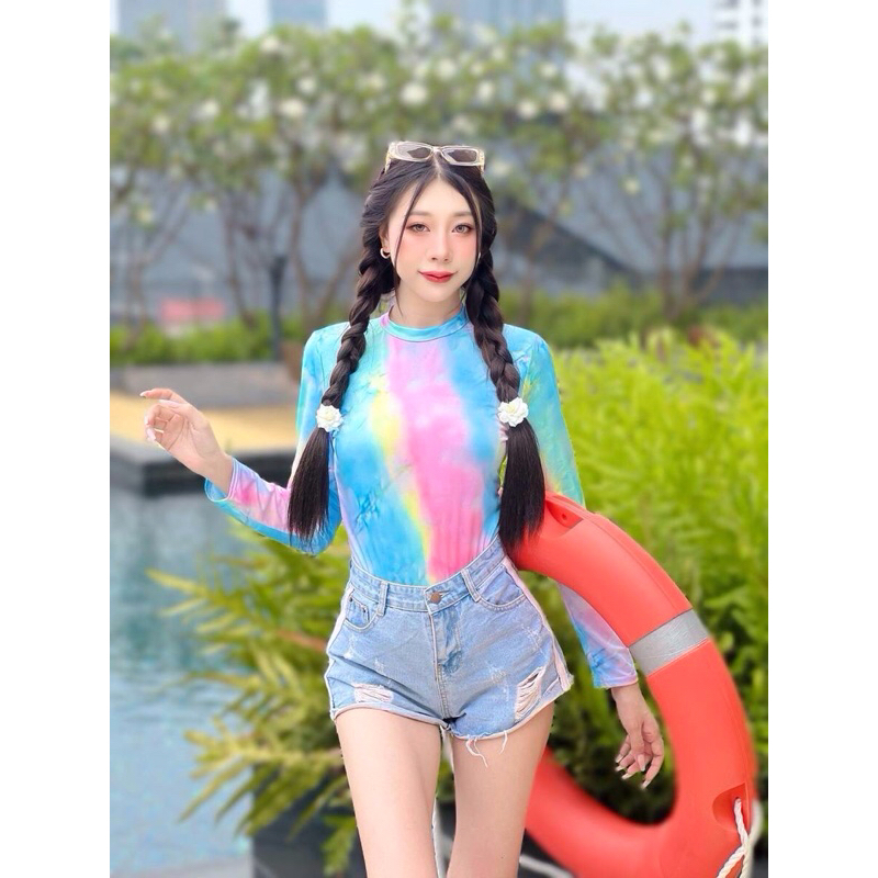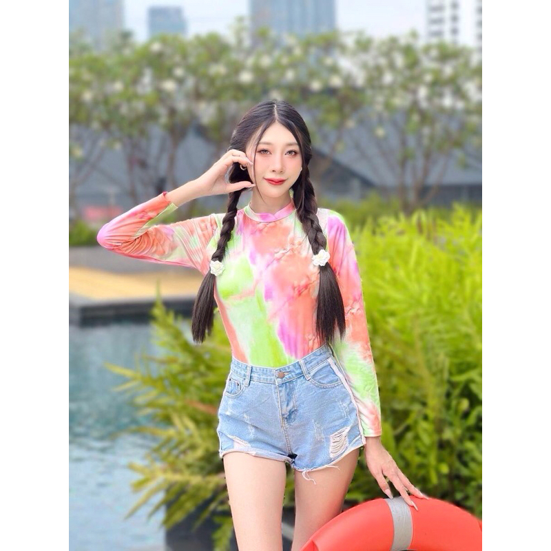 บอดี้สูท ซีทรูแขนยาวลายมัดย้อม + แมสเก๋ๆ Bodysuit by NICHA