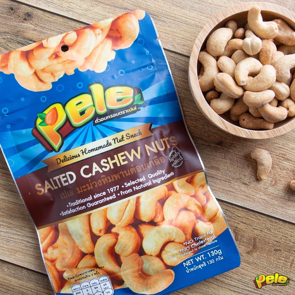 เม็ดมะม่วงหิมพานต์อบเกลือ สูตรเค็มน้อย เม็ดเต็มไซส์ใหญ่ ตรา Pele ห่อหนัก 130 กรัมชิ้นเดี่ยว ผลิตใหม่