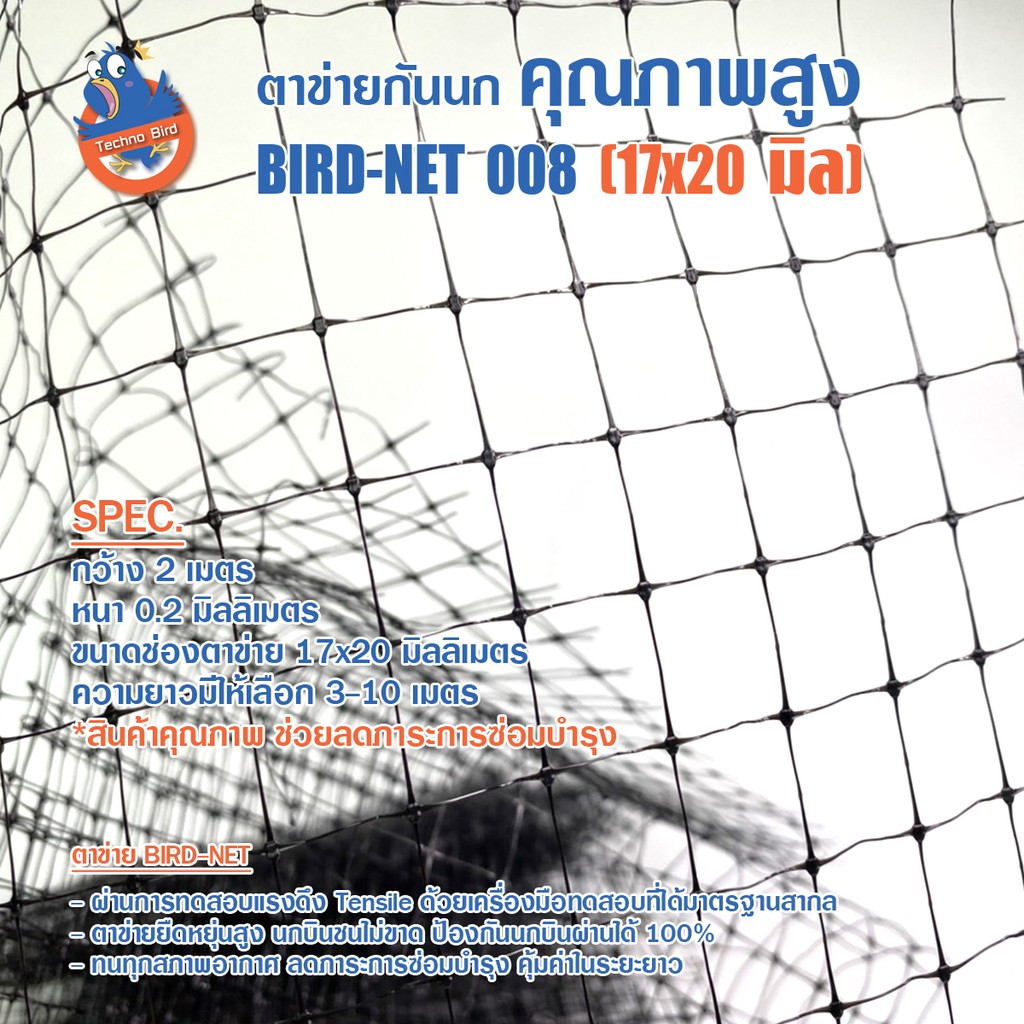 ตาข่ายกันนก PP (Polypropylene)หน้ากว้าง 2 เมตรช่องตาข่ายขนาด 17x20มิลลิเมตร รุ่น Bird-Net.008 (สีดำ)