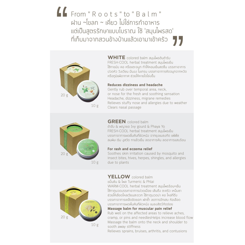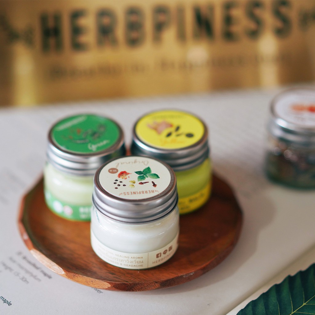 ยาหม่องขี้ผึ้ง Herbpiness ขนาด 20g. : สีขาว | สีเขียวพญายอ | สีเหลืองไพล BEESWAX BALM WHITE | GREEN | YELLOW