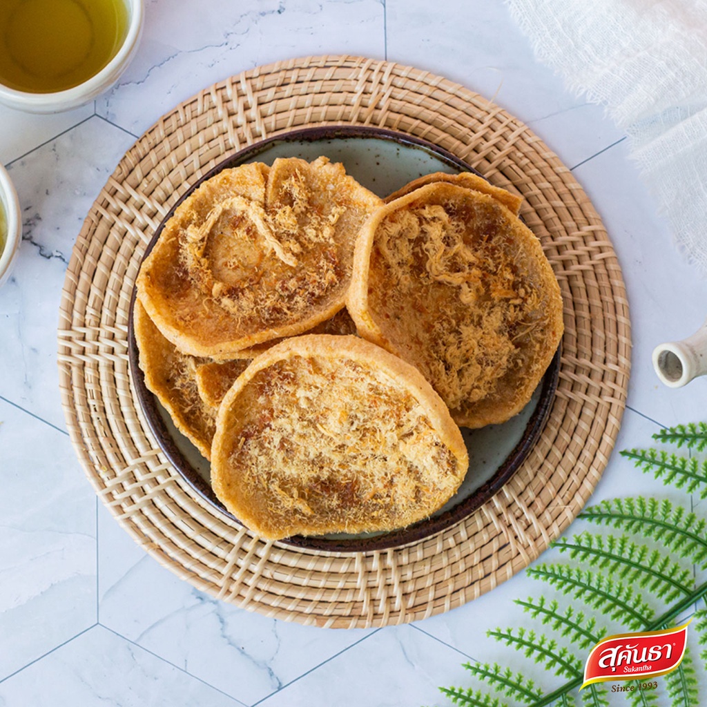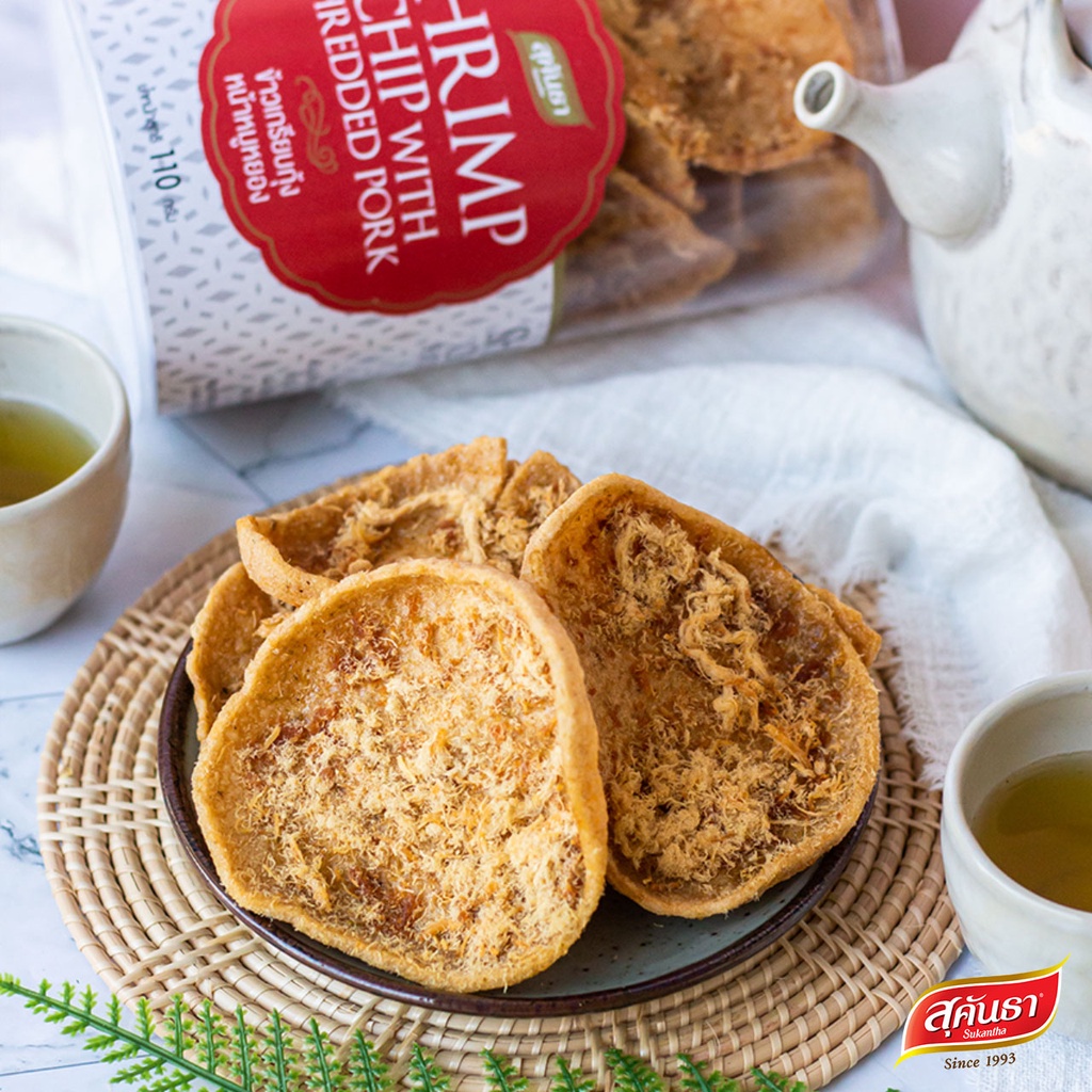 ขนมไทย สุคันธา ข้าวเกรียบกุ้งหน้าหมูหยอง 100 กรัม แบบกระป๋อง ขนมอร่อยจากเพชรบุรี SUKANTHA Shrimp Chip Shredded-Pork