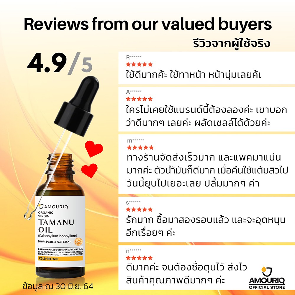 AMOURIQ® น้ำมันต้นกระทิง ทามานู ออร์แกนิกสกัดเย็น Tamanu Oil Organic Virgin Cold-Pressed Glass btl.