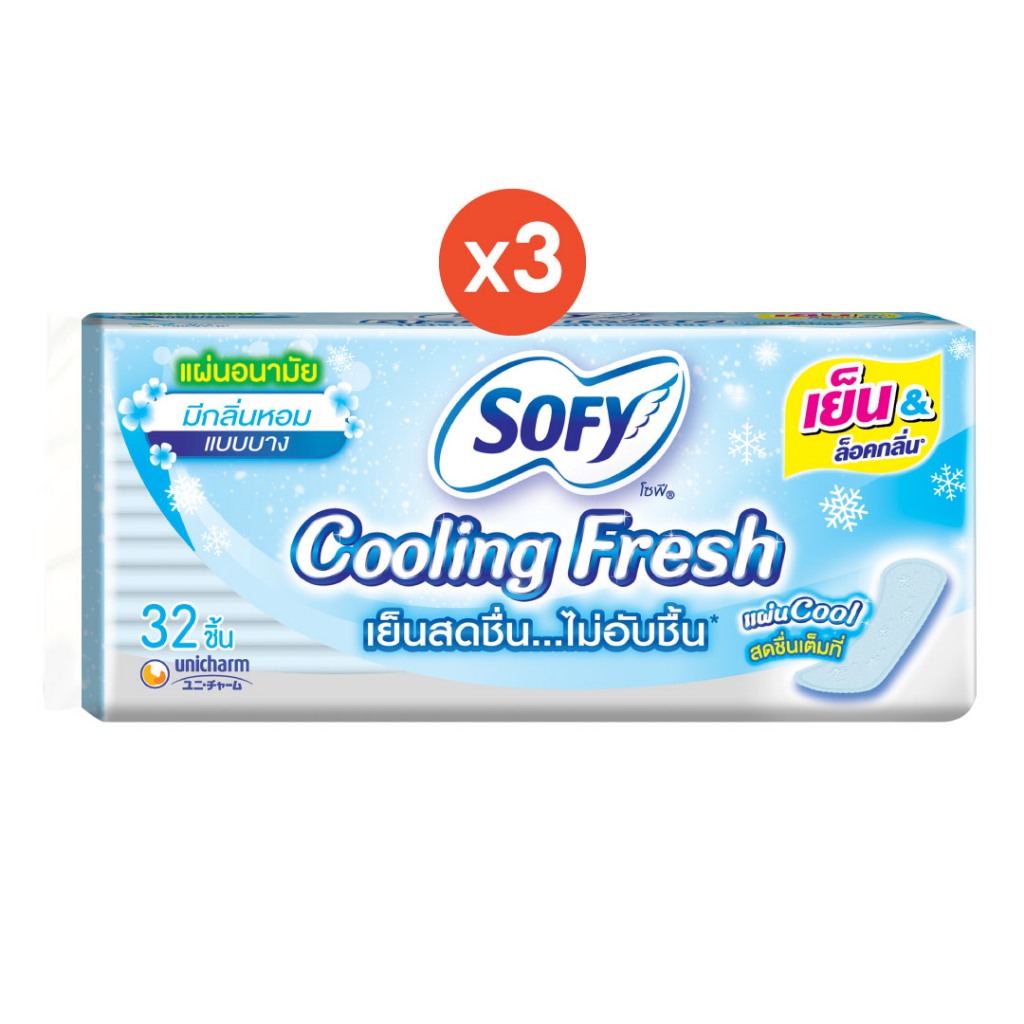 Sofy โซฟี แผ่นอนามัย คูลลิ่ง เฟรช แผ่นอนามัยสูตรเย็น แบบบาง มีกลิ่นหอม จำนวน 32 ชิ้น (3 แพ็ค)