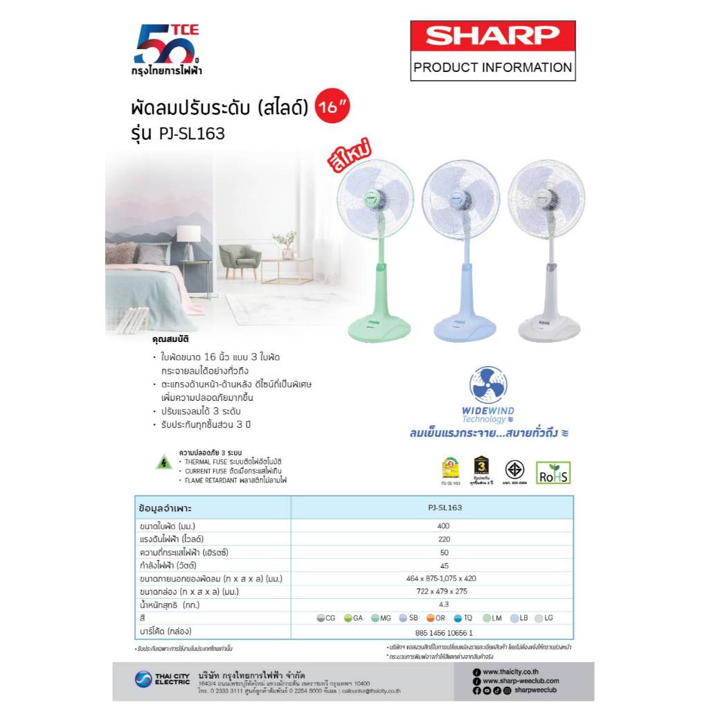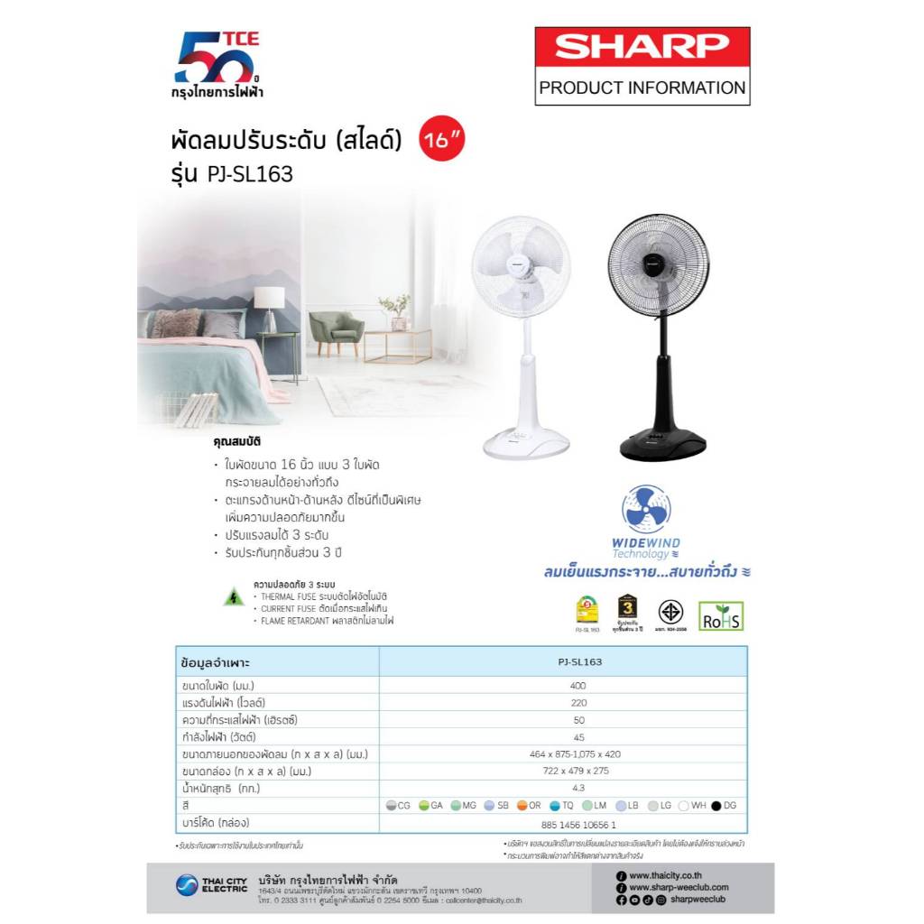 SHARP พัดลมสไลด์ 16 นิ้วรุ่นใหม่ PJ-SL163,165 (ของแท้รับประกันศูนย์)
