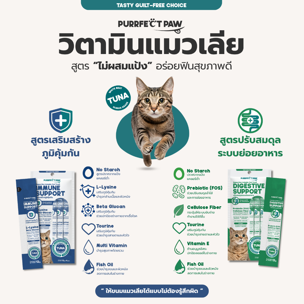 Purrfect Paw ขนมแมวเลีย ไม่ผสมแป้ง สูตรปรับสมดุลระบบย่อยอาหาร รสปลาทูน่าเนื้อขาว วิตามินแมวเลีย