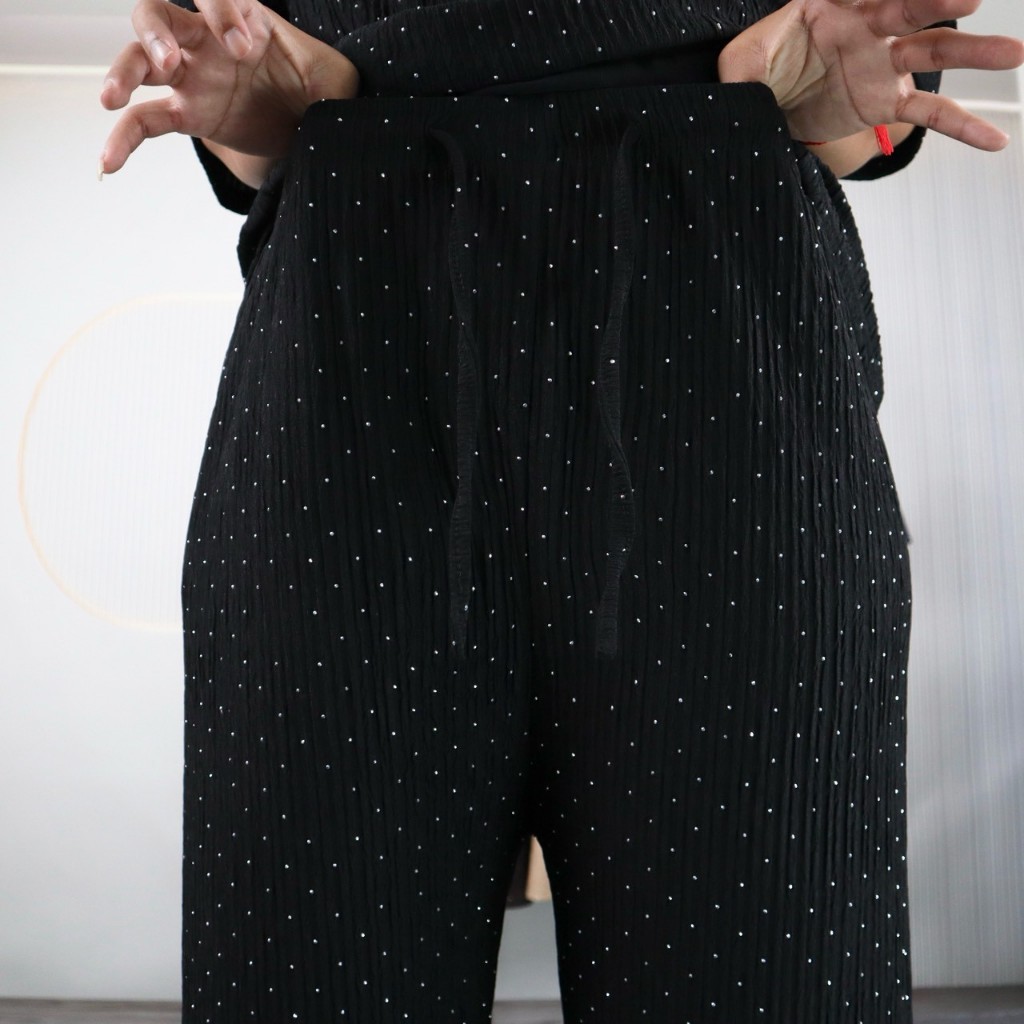 ชุดเซ็ท ไซส์จัมโบ้ เสื้อคอกลม แขนสั้น กางเกงขายาว ทรงขากระบอก ดีเทลติดเพรช ผ้าย่น ลายเปลือกไม้ สาวอวบใส่ได้ cb606#