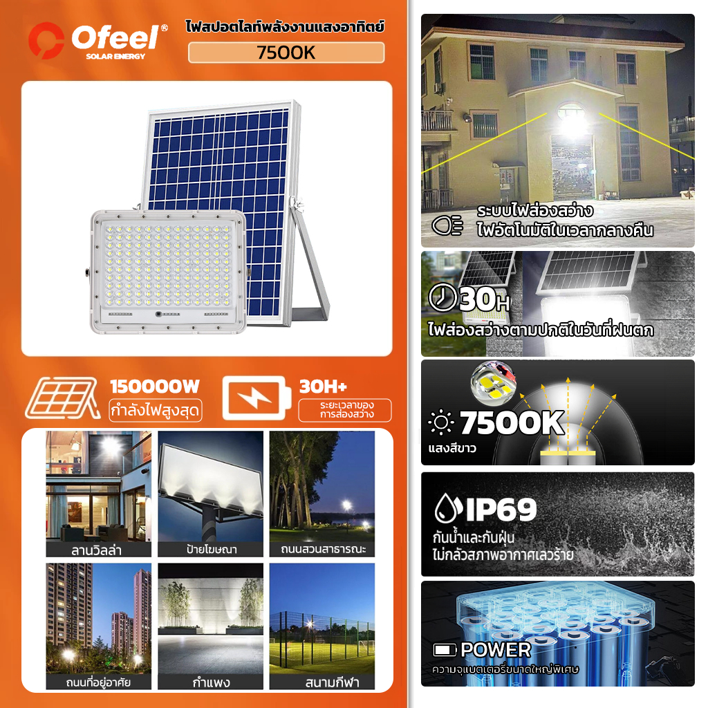 Ofeel ไฟโซล่าเซลล์ 150000Wไฟโซล่าเซล LEDโซล่าเซลล์ แสงสีขา กันน้ำIP69 ซื้อ1แถม1 ส่องสว่างตลอดทั้งคืน