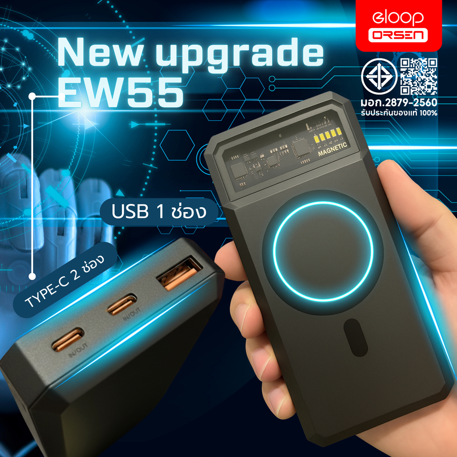 (ขายดี) Eloop EW55 แบตสำรอง 20000mAh PD 20W Power Bank ชาร์จไร้สาย Wireless MagCharge Magnetic ของแท้100%